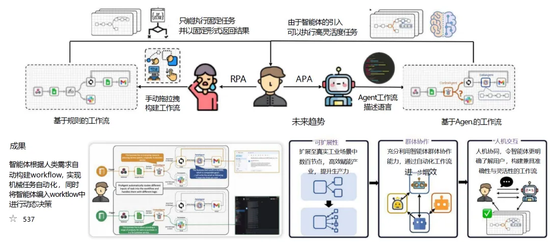 流程自动化技术的核心成果,是实现了工作流的自动化设计与构建。工作流的本质是固化的工具使用过程,基于大模型的工具学习系统,可根据用户的自然语言需求,自动决策工具调用顺序、构建业务流程,实现端到端的业务流程自动化。其未来发展趋势,是充分利用多智能体的群体协作能力,将工作流扩展至真实工业场景的数百节点,同时通过人机协同构建兼具准确性与灵活性的工作流,高效赋能产业、提升生产力。