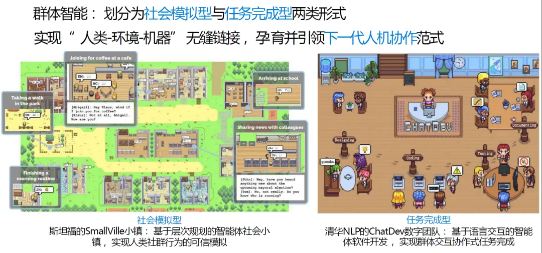 群体智能主要分为社会模拟型与任务完成型两类形式,共同实现 “人类 - 环境 - 机器” 的无缝链接,孕育下一代人机协作范式:
