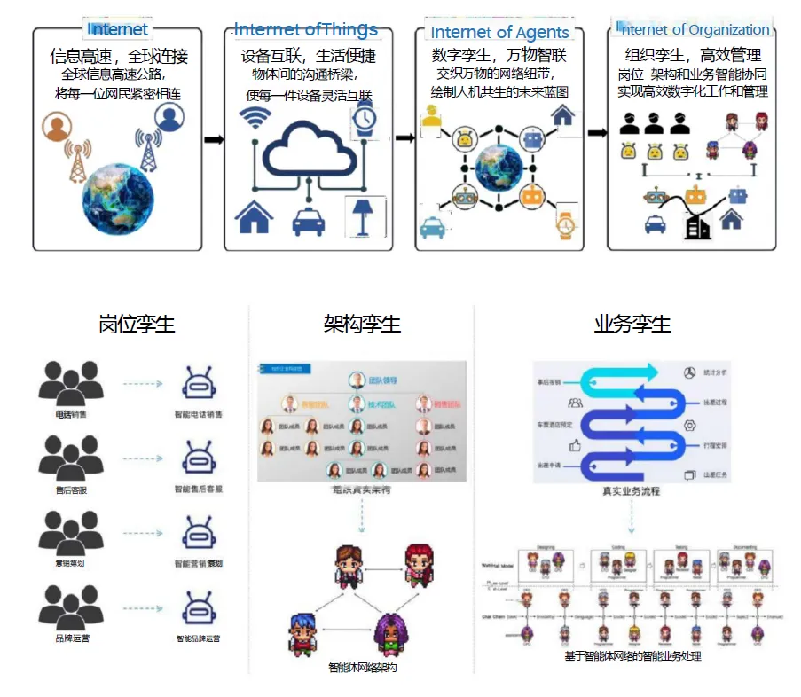 组织孪生的终极愿景,是实现智能体互联,从信息互联的互联网、设备互联的物联网,走向组织孪生的智能体互联网,实现岗位、架构、业务的智能协同,绘制人机共生的未来蓝图。