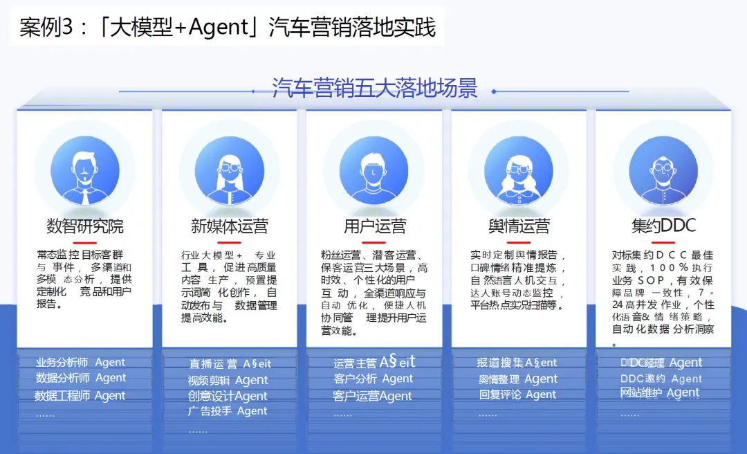 汽车营销智能体围绕汽车营销的全业务流程,打造了五大核心落地场景,通过多智能体的分工协作,实现 “一个人就是一个团队” 的运营效果,五大场景具体如下: