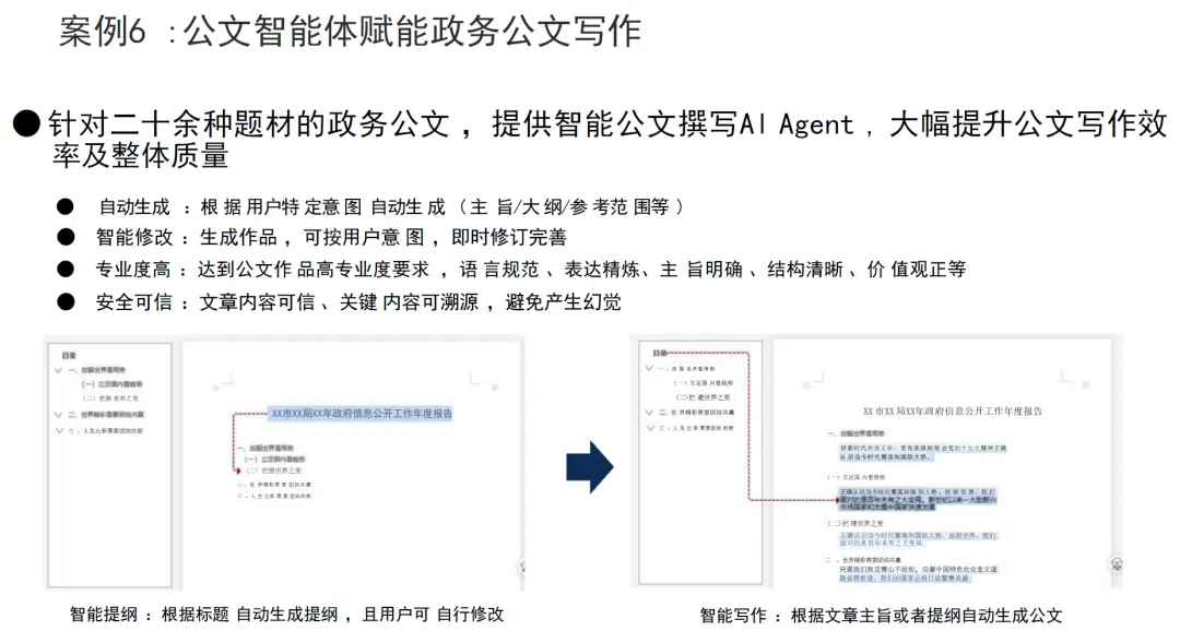 其核心能力包括:一是自动生成,根据用户的特定意图、主旨、大纲、参考范围,自动生成符合规范的公文内容;二是智能修改,可根据用户的意图,对已生成的公文进行即时修订与完善;三是专业度保障,输出内容符合公文写作的规范要求,实现语言规范、表达精炼、主旨明确、结构清晰、价值观正确;四是安全可信,文章内容与关键信息可溯源,有效避免大模型幻觉问题,确保公文内容的准确性与严肃性。同时,公文智能体可根据标题自动生成写作提纲,并支持用户自主修改,实现从提纲到全文的全流程智能化辅助。