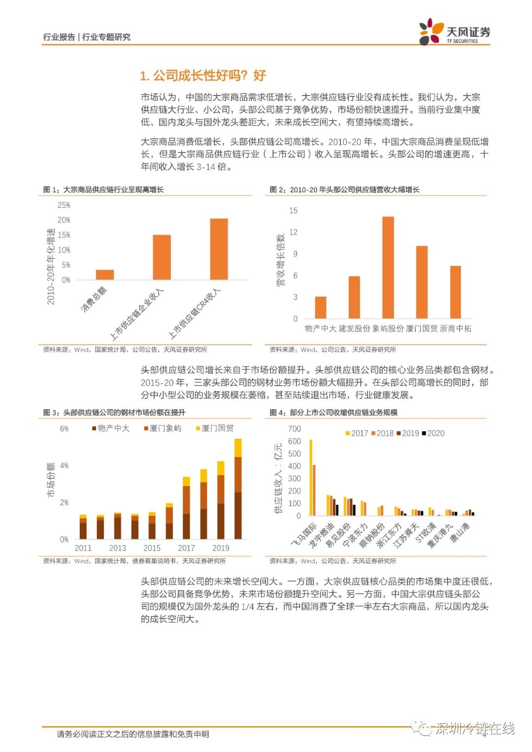 市场认为,中国的大宗商品需求低增长,大宗供应链行业没有成长性。我们认为,大宗供应链大行业、小公司,头部公司基于竞争优势,市场份额快速提升。当前行业集中度低、国内龙头与国外龙头差距大, 未来成长空间大, 有望持续高增长。
