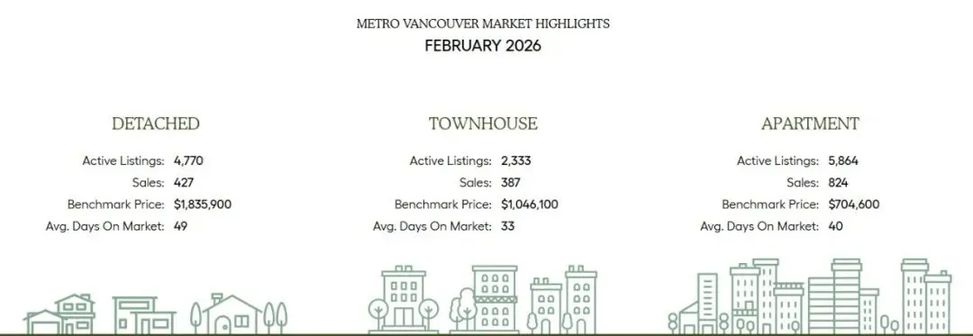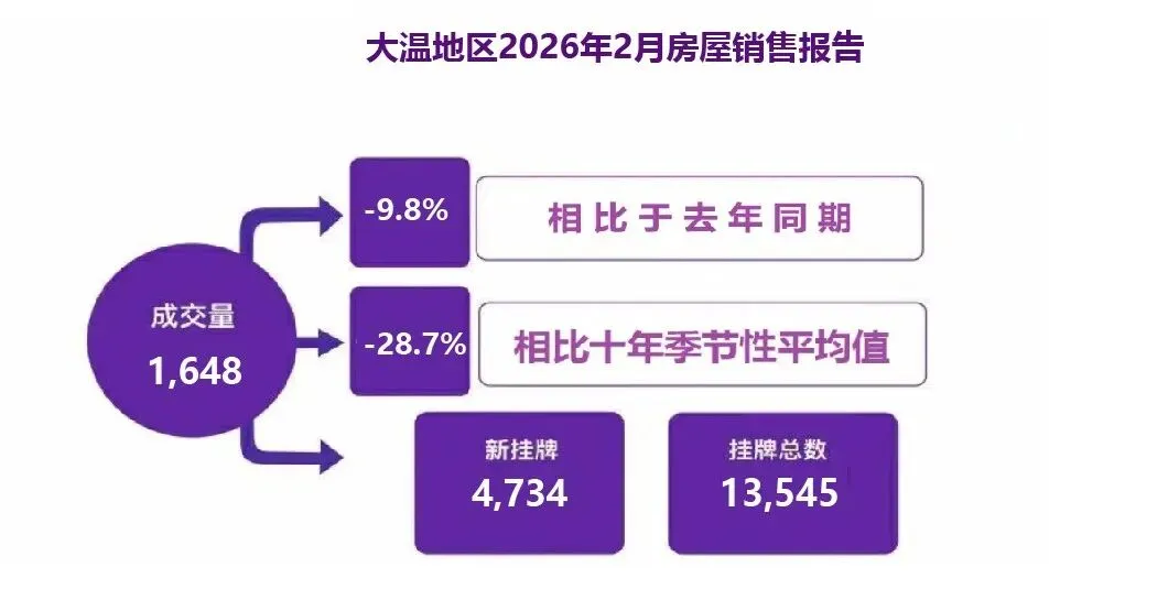 大温哥华房地产协会(GVR)报告称,2026年2月大温地区的住宅销售总量为1,648套,较2025年2月的1,827套下降9.8%。这一数据比10年季节性平均水平(2,310套)低28.7%。