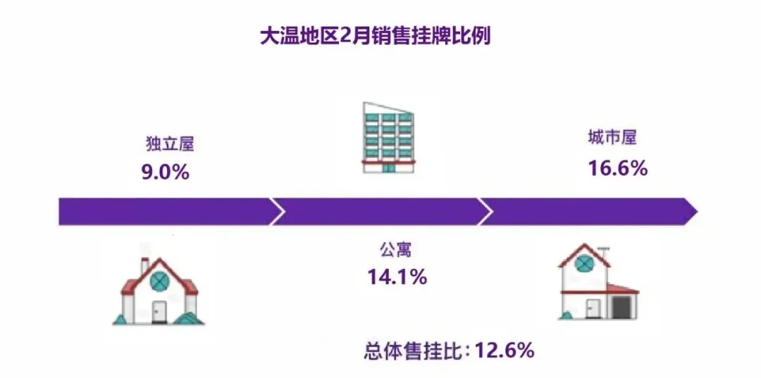 2026年2月的销售与挂牌比率为12.6%。按类型划分,独立屋为9%,城市屋为16.6%,公寓为14.1%。历史数据显示,当该比例持续低于12%时,房价通常会面临下行压力;而当该比例连续几个月高于20%时,房价则常常受到上行推动。