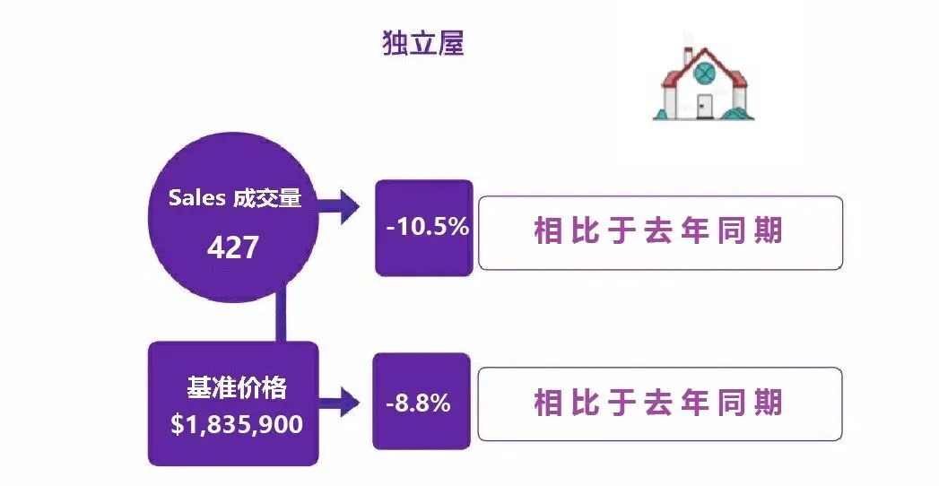 独立屋成交量为427套,较去年同期的477套下降10.5%;该类住宅的基准价格为$1,835,900。