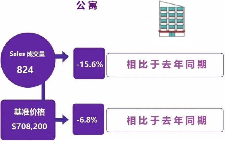 公寓成交量为824套,较去年同期的976套下降15.6%;该类住宅的基准价格为$708,200。