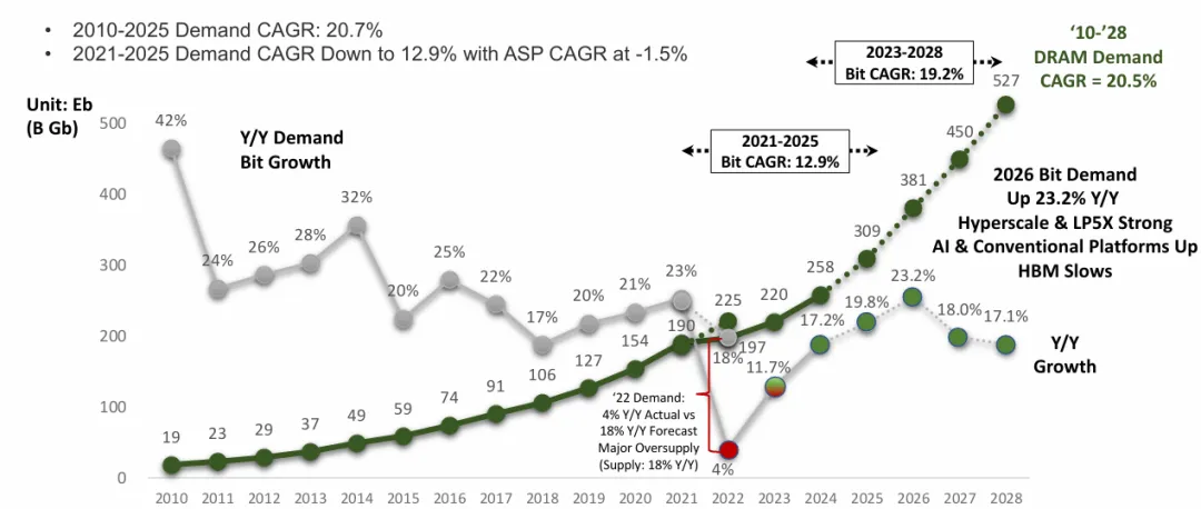 供需失衡是本次超级周期的核心矛盾。报告数据显示,2026年DRAM比特需求预计为381艾字节(Eb),同比增长23.2%;而供应仅为354 Eb,同比增长19.4%,存在显著缺口。