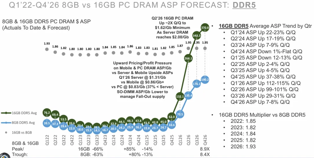 按品类环比涨幅:服务器DRAM(DDR5)预计上涨113-116%,PC DRAM(DDR5)上涨112%,移动DRAM(LPDDR5X)上涨93-103%。
