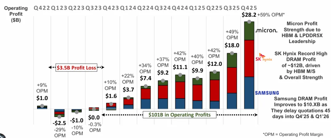 运营利润率(OPM):SK海力士以58% 的OPM领先,三星为47%,美光为46%。报告预测,到2026年第一季度,三家的OPM将进一步提升至61%-76%的区间。