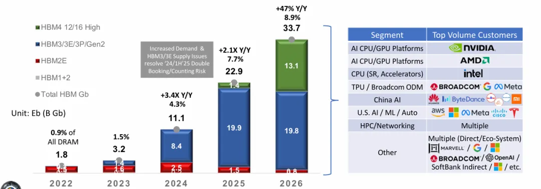 HBM(高带宽内存):作为AI加速器的关键组件,HBM需求持续爆炸式增长。报告预测,HBM占DRAM总比特需求的份额将从2022年的0.9%飙升至2026年的9.8%,2025年营收预计达到360亿美元,占DRAM总营收的24%。