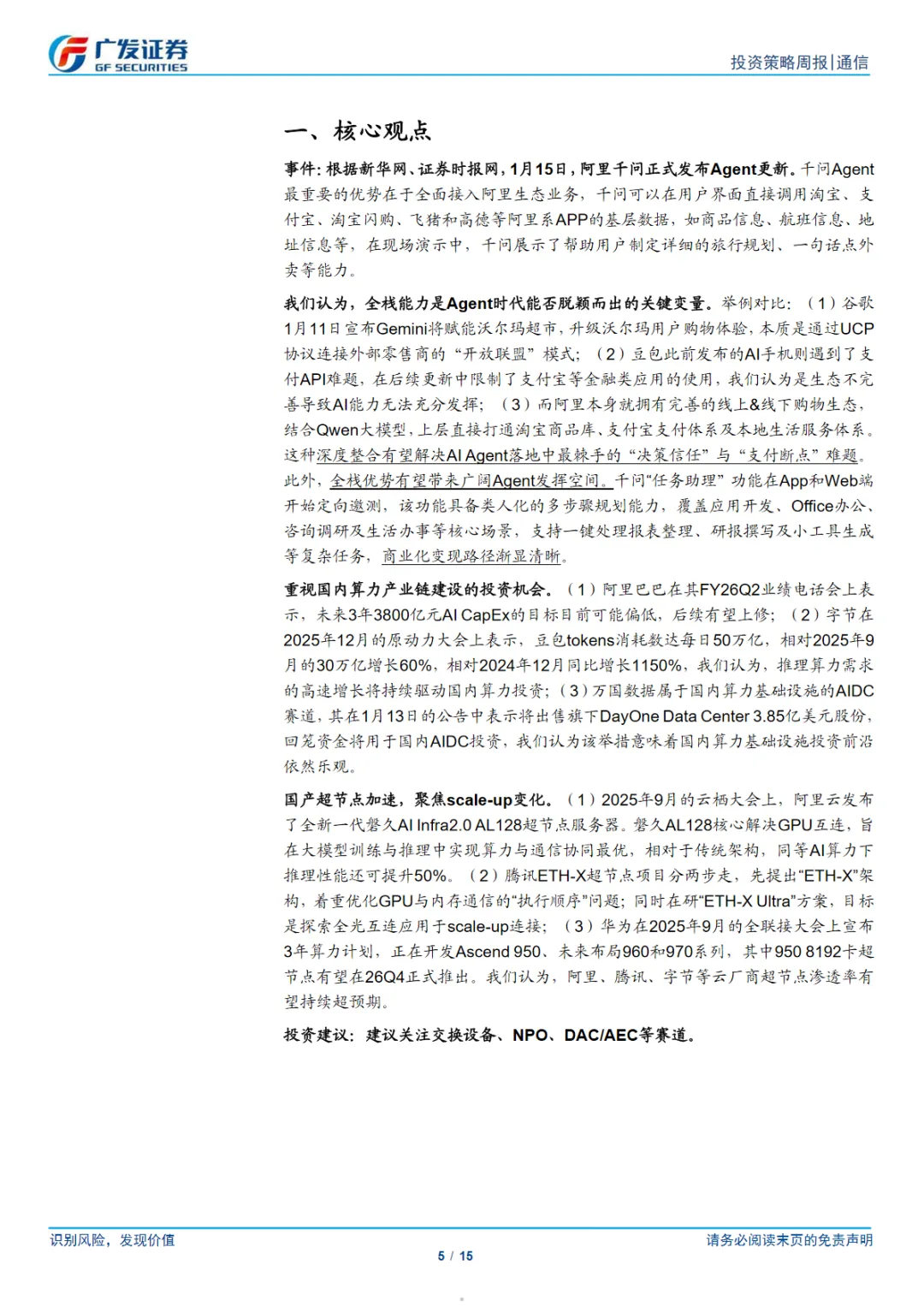 本篇行业报告可以通过扫下方知识星球下载。39元就可以下载星球所有报告。免费提供报告查找服务。近日,阿里巴巴旗下的千问Agent正式发布更新,标志着AI Agent时代的竞争进一步加剧。千问Agent的最大优势在于其全面接入阿里生态业务的能力,用户界面可以直接调用淘宝、支付宝等阿里系APP的基层数据,如商品信息、航班信息等。这一深度整合有望解决AI Agent落地中的“决策信任”与“支付断点”难题,同时为Agent的广泛应用提供了广阔空间。全栈能力被认为是AI Agent时代脱颖而出的关键。阿里的这一更新,与谷歌的Gemini模式和豆包AI手机的生态不完善形成鲜明对比。阿里的线上&线下购物生态结合Qwen大模型,使得千问Agent在应用开发、Office办公、咨询调研及生活办事等核心场景中具备类人化的多步骤规划能力,商业化变现路径渐显清晰。此外,国内算力产业链建设的投资机会也值得重视。阿里巴巴、字节跳动等巨头在AI CapEx上的投入不断增加,推理算力需求的增长将持续驱动国内算力投资。万国数据出售旗下股份回笼资金用于国内AIDC投资,显示国内算力基础设施投资前景乐观。在超节点领域,阿里、腾讯、华为等国内云厂商的加速布局,预示着scale-up变化的聚焦。阿里的磐久AI Infra2.0 AL128超节点服务器解决了GPU互连问题,提升了推理性能。腾讯和华为也在探索全光互连应用于scale-up连接,超节点渗透率有望持续超预期。投资者应关注交换设备、NPO、DAC/AEC等赛道的投资机会。同时,需警惕AI基础设施建设不及预期、AI应用发展不及预期、AI领域进出口政策变化以及国际合作减少的风险。随着AI技术的不断进步和应用的深入,全栈能力的构建和算力产业链的投资将成为AI Agent时代的关键竞争点。免责声明:以上分享报告为公开合法渠道获得,内容大部分来源于网络,版权归原作者所有,如有侵权,请及时与我们联系,我们将第一时间保障您的权益。推荐内容仅供参考学习,不构成投资建议。