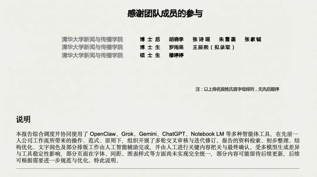 《OpenClaw发展研究报告1.0》是清华大学清新研究团队(人类学术团队)主导的研究成果,由沈阳教授带领的跨学科团队完成,研究过程中虽使用OpenClaw人机协作工具流辅助资料检索、排版润色等工作,但核心的研究框架设计、内容分析、结论提炼与关键内容把关均由人工完成,是典型的“人类主导+AI辅助”的学术研究模式。