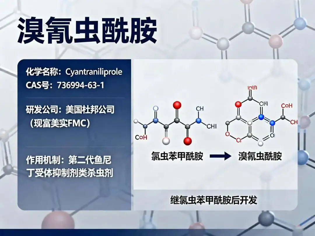 溴氰虫酰胺(Cyantraniliprole, CAS: 736994-63-1)是美国杜邦公司(现富美实FMC)继氯虫苯甲酰胺之后开发的第二代鱼尼丁受体抑制剂类杀虫剂。作为双酰胺类杀虫剂的代表性产品,其分子结构为C19H14BrClN6O2,分子量473.71。该化合物通过激活害虫体内的鱼尼丁受体,引起钙离子过度释放,导致肌肉麻痹而死亡,对鳞翅目、半翅目、鞘翅目等多种害虫具有高效防治效果。