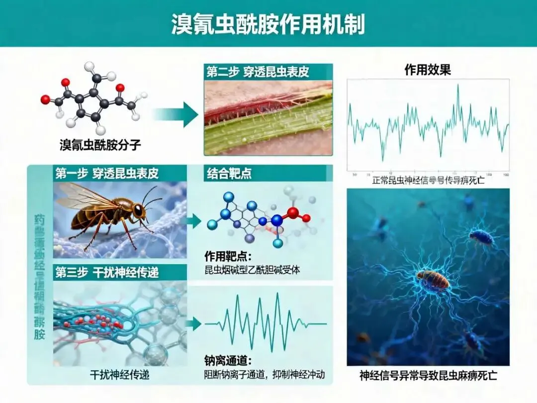 溴氰虫酰胺属于IRAC分类第28组(鱼尼丁受体调节剂)。其通过特异性激活昆虫肌肉细胞内的鱼尼丁受体,诱导内质网钙离子库的快速释放,导致钙离子浓度异常升高,引发肌肉持续收缩、麻痹,最终导致害虫停止取食并死亡。与传统神经毒剂不同,其作用位点独特,对已产生抗性的害虫仍保持高效活性。