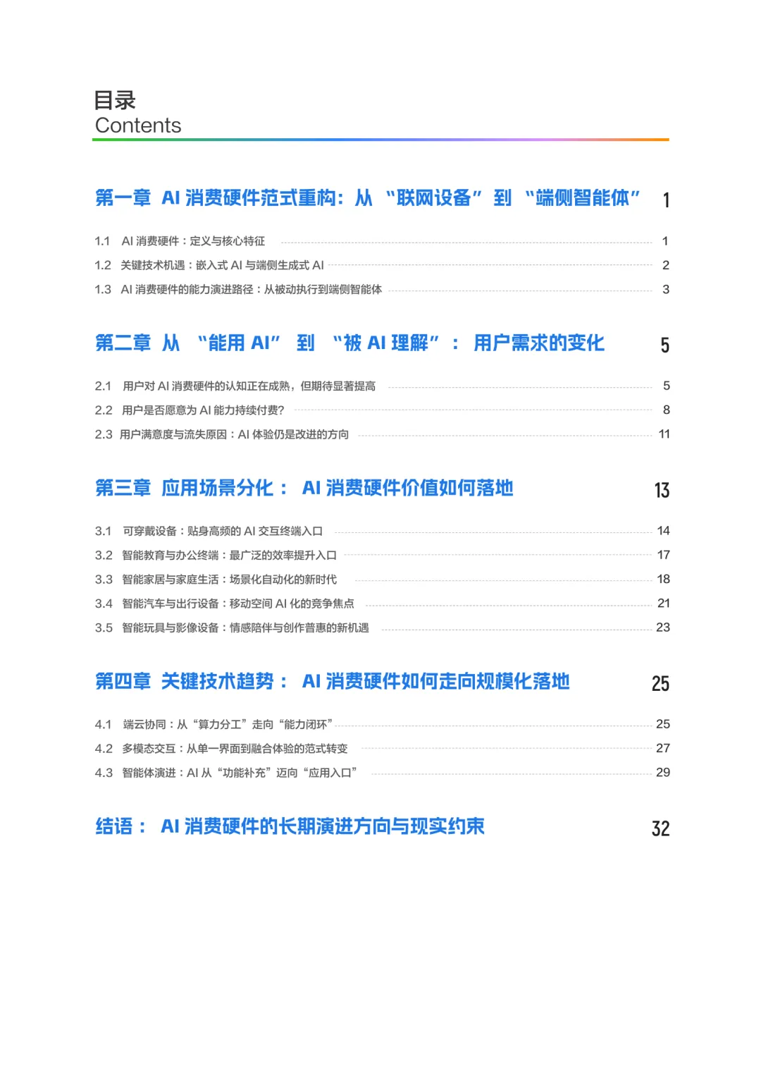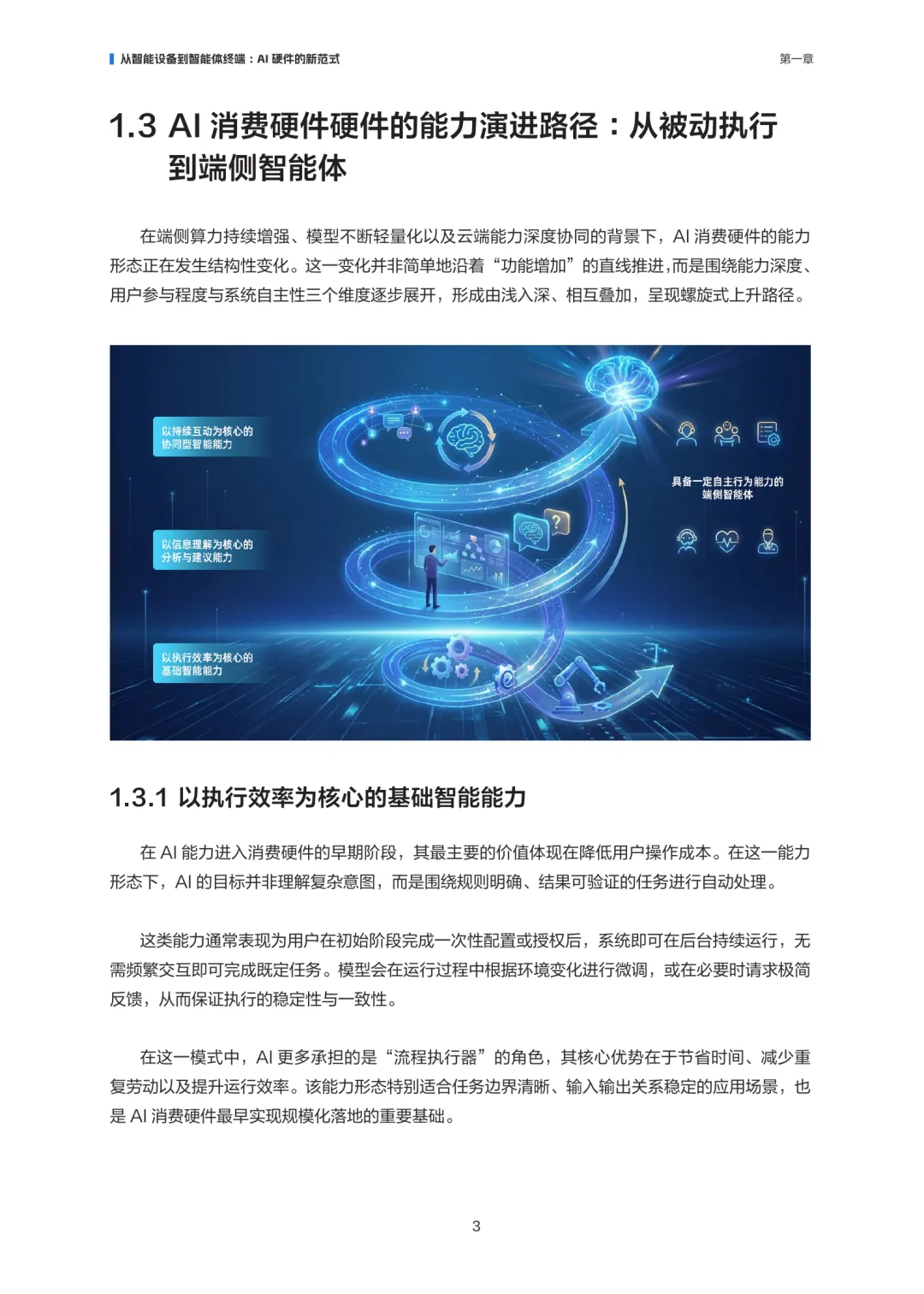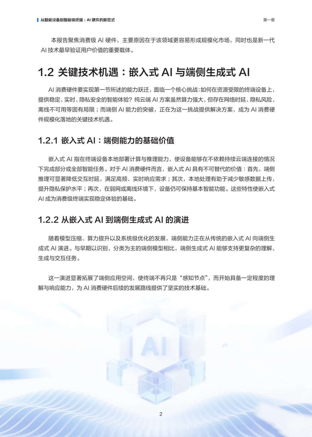 AI消费硬件正经历从“联网设备”向“端侧智能体”的范式转变。这类设备以人工智能为核心驱动,深度嵌入感知、理解、推理与持续学习能力,使终端不再只是执行指令的工具,而是具备自主性和交互能力的智能体。其核心特征在于AI能力贯穿系统架构、交互方式与价值创造过程,对用户体验产生持续影响。在技术层面,嵌入式AI为终端提供本地计算与推理能力,降低时延、增强隐私保护,并确保离线环境下的基本功能。随着模型压缩与算力提升,端侧生成式AI正在拓展应用边界,使设备具备更复杂的理解与生成能力,推动AI消费硬件从被动执行转向主动响应。AI消费硬件的演进不仅依赖技术突破,还需在成本、体验、隐私与系统复杂度之间建立平衡,才能在真实场景中持续兑现用户可感知的价值。