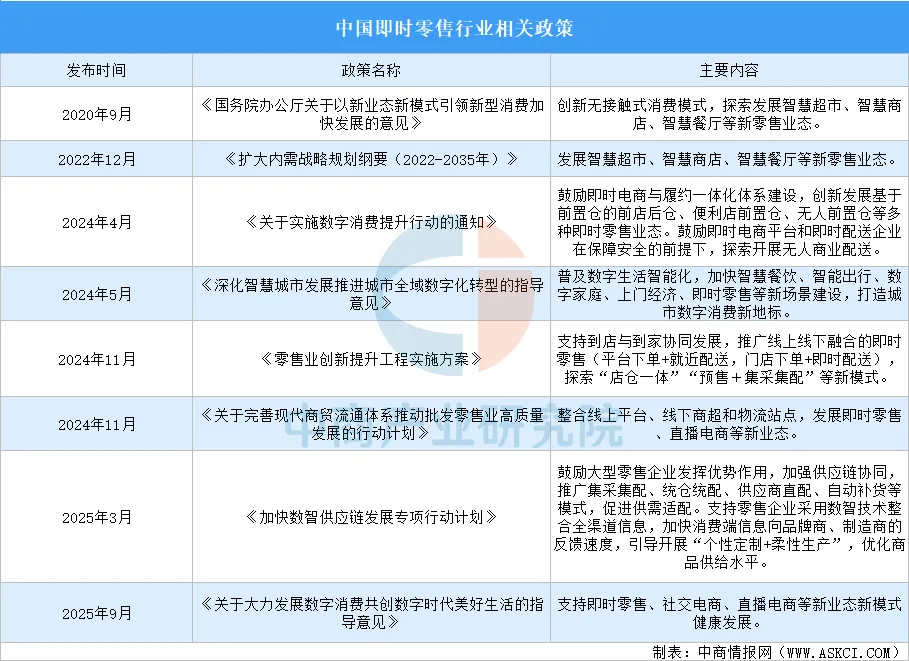 近年来,中国即时零售行业的发展受到国家政策多维度支持。《关于实施数字消费提升行动的通知》首次明确鼓励前置仓、无人配送等履约体系建设,《深化智慧城市发展推进城市全域数字化转型的指导意见》将即时零售列为城市数字消费新地标的核心场景,而《零售业创新提升工程实施方案》更提出"到店与到家协同发展"的具体路径。进入2025年,政策进一步向供应链深处延伸,《加快数智供应链发展专项行动计划》强调通过数智技术打通消费端与制造端,推动"个性定制+柔性生产",标志着即时零售政策已从终端业态创新升级为全产业链数字化重构。这一系列政策组合拳将利好行业发展。