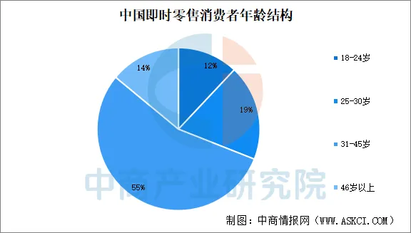 年轻群体是即时零售的主要客群。数据显示,我国即时零售31-45岁消费群体占比达55%,18-24岁消费群体占比12%,25-30岁消费群体占比19%,46岁以上消费群体占比14%。
