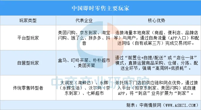 即时零售的产业链涉及“用户-平台/自营-本地商家-配送”四大环节,根据主导角色不同,可分为三大类玩家:平台型玩家、自营型玩家、传统零售转型者。