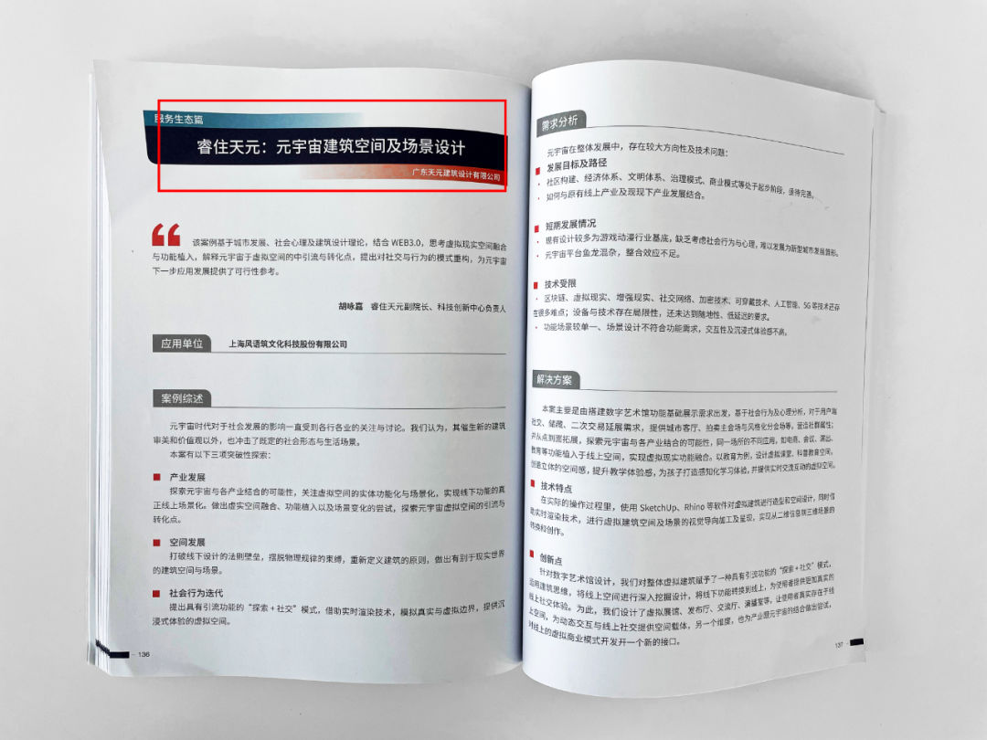 睿住天元在对元宇宙的功能、需求、社会发展等多个维度的思考后,延展“虚拟与现实的映射、融合、拓展”技术体系,案例收录在案例集服务生态篇。