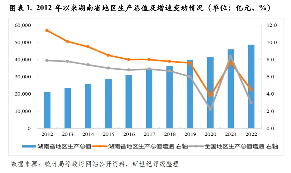 经济实力:2022年,湖南省经济运行难中有进、稳中向好,全年实现地区生产总值4.87万亿元,经济总量仍居全国各省降序第9位;同比增长4.5%,经济增速较上年有所回落,但高于全国水平1.5个百分点、处于各省前列。湖南省经济结构仍以第三产业为主导,2022年三次产业结构为9.5:39.4:51.1,但全省第三产业增加值增速较大幅回落,工业对经济增长的贡献率较上年提高13.6个百分点至42.6%,成为稳住全省经济大盘的“压舱石”,其中制造业支撑作用强劲。2022年,湖南省固定资产投资维持平稳增长,全年全省固定资产投资同比增长6.6%,较全国水平快1.5个百分点,其中,基础设施投资明显提速,但房地产开发投资出现下降,此外,全省商品房销售面积和销售额同比均出现较大降幅,区域房地产市场景气度低迷。2023年前三季度,湖南省实现地区生产总值3.70万亿元,同比增长4.0%,经济运行总体保持平稳,产业稳步恢复,其中,服务业增速相对较高。