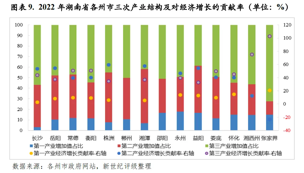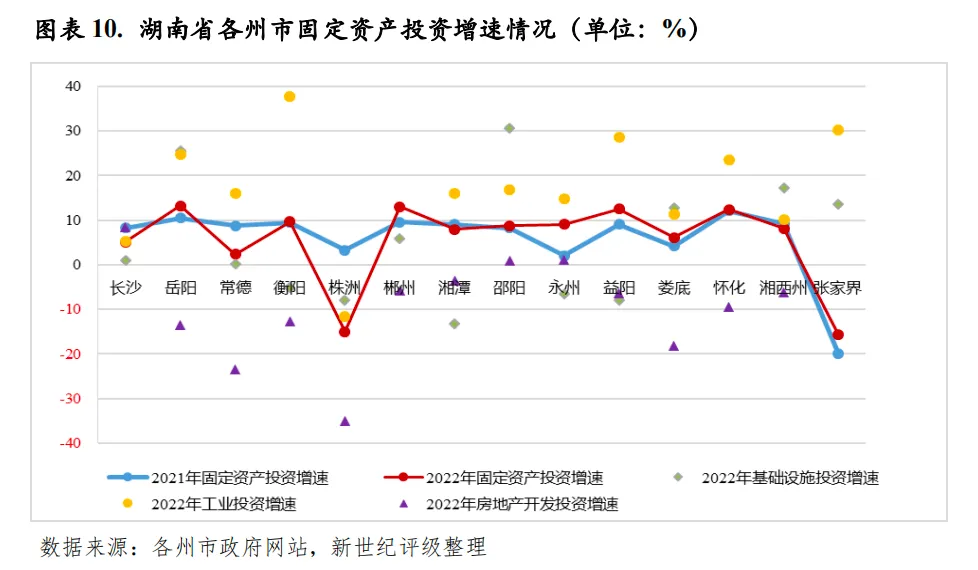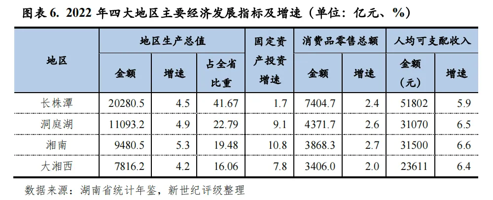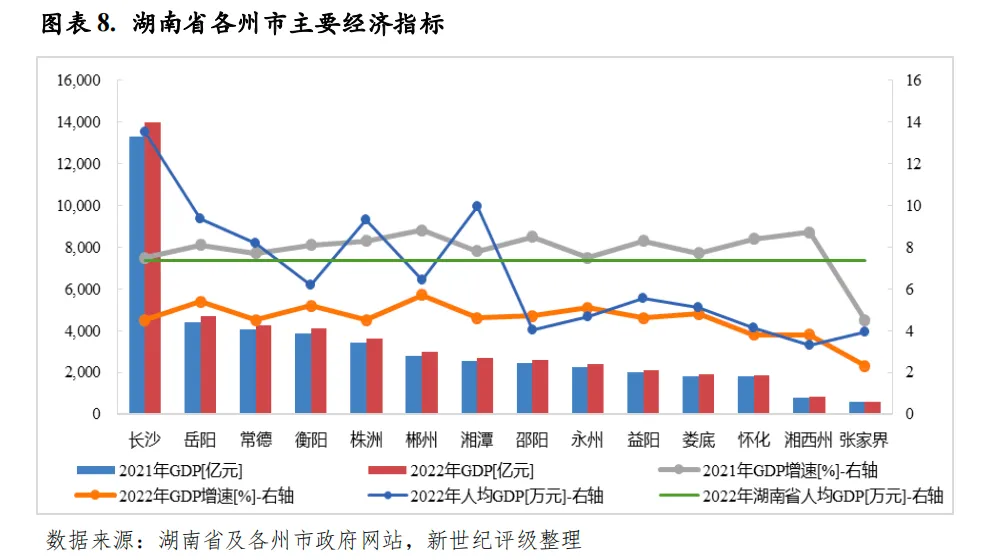 从下辖各州市情况看,2022年,湖南省各州市经济增速均较大幅回落,但除张家界外,其余州市经济增速均高于全国水平。湖南省各州市经济发展梯度大,省会长沙经济实力一枝独秀,经济总量和人均地区生产总值均遥遥领先。2022年,长沙实现地区生产总值13966.11亿元,占全省经济总量的28.70%,是经济总量排名第二岳阳的3倍;人均地区生产总值为13.52万元,是全省唯一人均地区生产总值超过10万元的州市。长株潭地区的株洲和湘潭作为全省重要的工业城市,工业基础较强,其中,株洲的轨道交通装备制造业已形成千亿产业集群,产业竞争力强,两市经济总量虽居全省中游,但人均地区生产总值均居全省前列,不过株洲2022年以来固定资产投资持续下降,2022年及2023年上半年度,株洲固定资产投资同比增速分别为-15.0%和-8.6%。岳阳、常德和衡阳经济总量居全省第二梯队,2022年地区生产总值区间为4000-5000亿元,其中,岳阳和衡阳作为湖南省“十四五”重点建设的两大省域副中心城市,区域经济发展前景较好。而大湘西地区整体经济实力仍偏弱,除邵阳外,其余4个州市经济总量持续居全省后4位,2022年地区生产总值仍均不到2000亿元,其中,湘西州和张家界经济基础薄弱,且近年主导产业生态旅游业受冲击较大,区域发展环境不理想。2023年上半年度,湖南省各州市整体经济运行保持平稳,经济总量排序较2022年无变化。