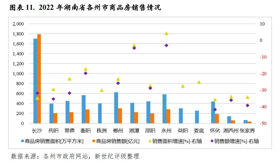 2022年,湖南省经济运行难中有进、稳中向好,经济总量仍居全国各省降序第9位,经济增速较上年有所回落,但高于全国水平、处于各省前列。湖南省经济结构仍以第三产业为主导,但2022年第三产业增加值增速较大幅回落,工业成为稳住全省经济大盘的“压舱石”,其中制造业支撑作用强劲。2022年,湖南省固定资产投资维持平稳增长,基础设施投资明显提速,但房地产开发投资出现下降,此外,全省商品房销售面积和销售额同比均出现较大降幅,区域房地产市场景气度低迷。2023年前三季度,湖南省经济运行总体保持平稳,产业稳步恢复,其中,服务业增速相对较高。