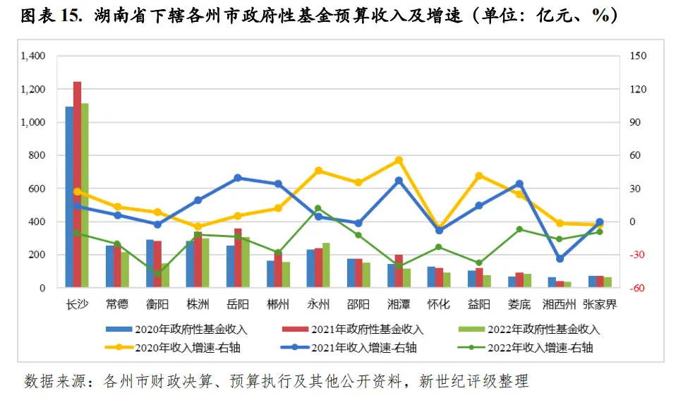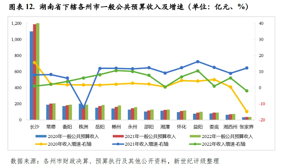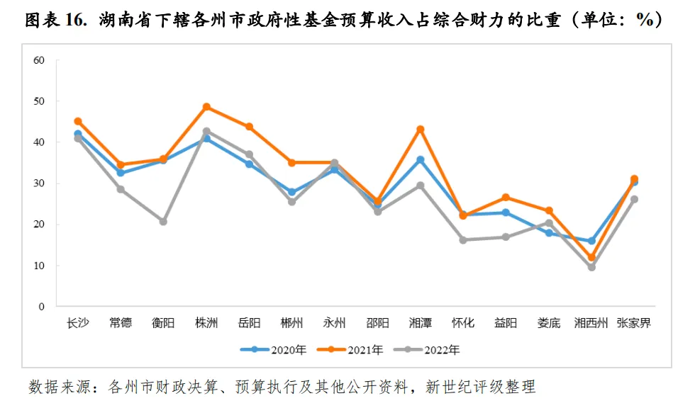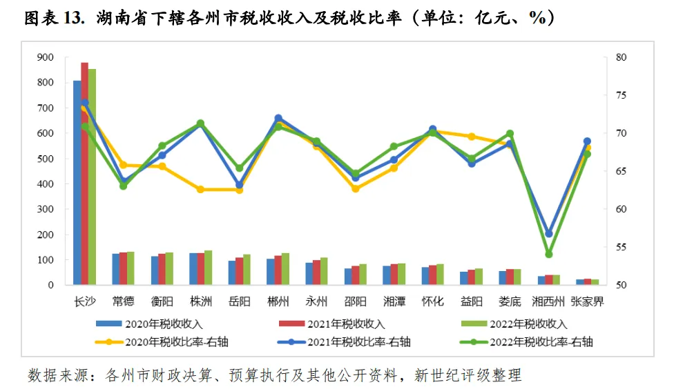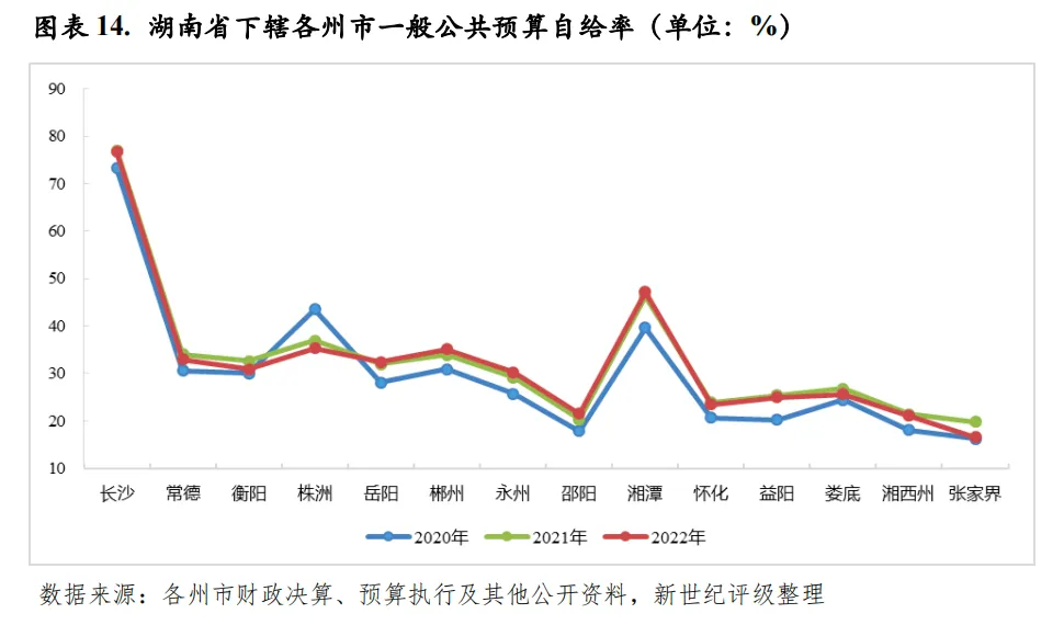从下辖各州市情况来看,2022年除张家界外,湖南省其余州市一般公共预算收入均实现增长,但整体增速显著放缓,受收入增速差异影响,邵阳和湘潭、益阳和娄底收入规模排序发生互换,但彼此间收入差距均很小。长沙2022年税收收入出现小幅下滑,一般公共预算收入在非税收入增长的拉动下实现微增,因而税收比率有所降低,但仍处于全省前列,且一般公共预算收入规模和自给能力仍居全省绝对领先地位。2022年长沙实现一般公共预算收入1202.00亿元,是收入排名第二常德的近6倍,同比增长1.2%,其中,税收收入852.88亿元,同比下降3.1%,税收比率较上年下降3.08个百分点至70.96%;一般公共预算自给率为76.74%,为全省唯一自给率超过50%的州市。常德2022年一般公共预算收入规模仍居全省第二,收入规模略超200亿元,为207.63亿元,但与排名第三的衡阳收入差距较小。大湘西地区整体财力偏弱,其中,娄底、湘西州和张家界2022年一般公共预算收入仍均不到100亿元,收入规模居全省后三位。除上述州市外,湖南省其余州市2022年一般公共预算收入规模区间为100-200亿元,且顺位排序下彼此间收入规模差距均不显著。政府性基金预算收入方面,2022年,由于土地市场不景气,除永州外,湖南省其余州市政府性基金预算收入均出现下滑,且多数州市降幅较大,政府性基金预算收入对综合财力的贡献度均有所下降,但目前基金收入仍为湖南省多数州市综合财力的重要支撑。