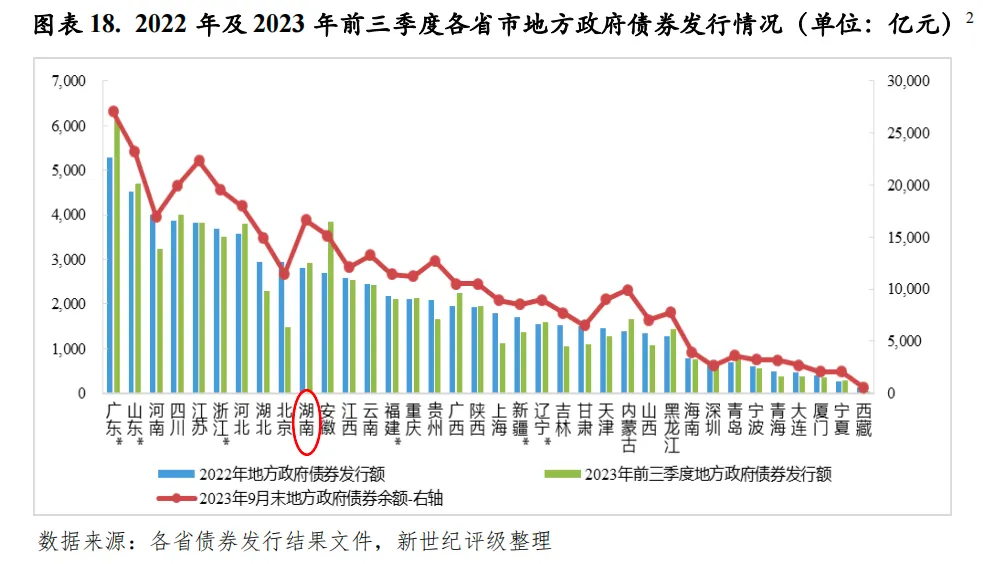 2022年,湖南省发行地方政府债券2807.15亿元,同比下降6.3%,发行规模位列36个已发债省市降序第10位,其中新增债券和再融资债券分别为1799.43亿元和1007.72亿元。2023年前三季度,湖南省发行地方政府债券2927.40亿元,发行规模位列36个已发债省市降序第9位。截至2023年9月末,湖南省地方政府债券余额为1.66万亿元,位列36个已发债省市降序第8位。