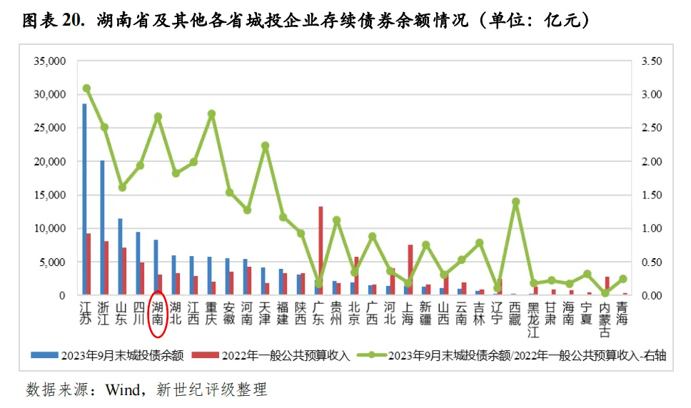 2022年以来,湖南省城投企业发债活跃度仍相对较高,2022年和2023年前三季度,湖南省城投债发行规模分别为2513.54亿元和2356.11亿元,在各省发行规模降序排序中均列第5位。从城投企业存续债券规模来看,截至2023年9月末,湖南省存续城投债余额为8289.40亿元,居全国各省降序第5位,低于江苏省、浙江省、山东省和四川省,整体城投债余额仍较大。此外,以一般公共预算收入对存续城投债券余额的覆盖程度来看,湖南省覆盖程度也较低,2023年9月末湖南省城投企业存续债券余额是其2022年一般公共预算收入的2.67倍,居全国各省降序第3位,仅次于江苏省和重庆市。