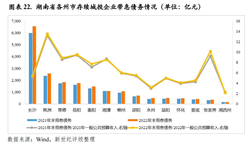 从城投企业带息债务情况看,截至2022年末,湖南省城投企业带息债务余额合计为2.46万亿元,是2022年全省一般公共预算收入的7.93倍,一般公共预算收入对城投企业带息债务的覆盖程度较低。从下辖各州市情况来看,各州市带息债务区域分布情况基本与城投债余额分布情况一致,主要集中于经济和财力靠前的州市,以长沙和株洲为主。2022年末全省城投企业带息债务超过千亿元的州市包括长沙、株洲、常德、岳阳、衡阳和湘潭等6个,带息债务余额分别为5993.99亿元、2372.47亿元、1749.53亿元、1612.94亿元、1308.36亿元和1104.55亿元。以一般公共预算收入对城投企业带息债务的覆盖程度来看,湖南省各州市整体覆盖程度偏低。全省2022年末城投企业带息债务超过其2022年一般公共预算收入7倍以上的州市共6个,包括株洲、张家界、岳阳、常德、湘潭和衡阳,以株洲城投企业债务压力最大。具体来看,上述6个州市存续城投企业2022年末带息债务与其2022年一般公共预算收入的比分别为13.55倍、10.17倍、9.54倍、8.90倍、8.54倍和7.71倍。而湘西州城投企业债务压力相对较轻,其存续城投企业2022年末带息债务与其2022年一般公共预算收入的比为2.19倍,为全省唯一该比率不超过3倍的州市。