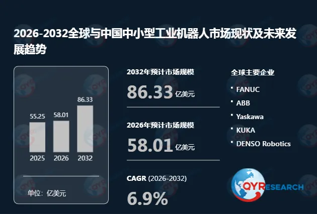 根据QYR(恒州博智)的统计及预测,2025年全球中小型工业机器人市场销售额达到了55.25亿美元,预计2032年将达到86.33亿美元,年复合增长率(CAGR)为6.9%(2026-2032)。