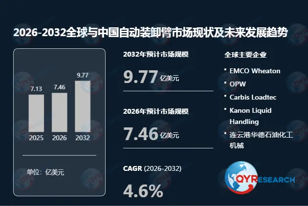 根据QYR(恒州博智)的统计及预测,2025年全球自动装卸臂市场销售额达到了7.13亿美元,预计2032年将达到9.77亿美元,年复合增长率(CAGR)为4.6%(2026-2032)。