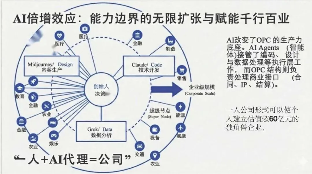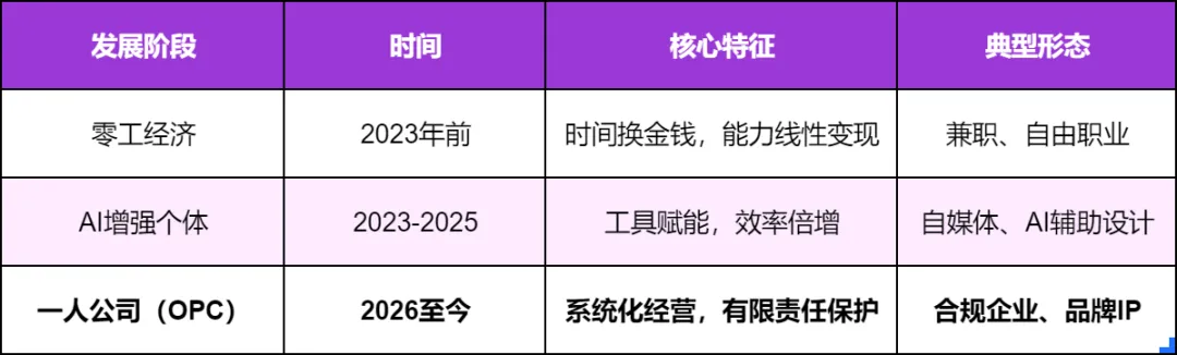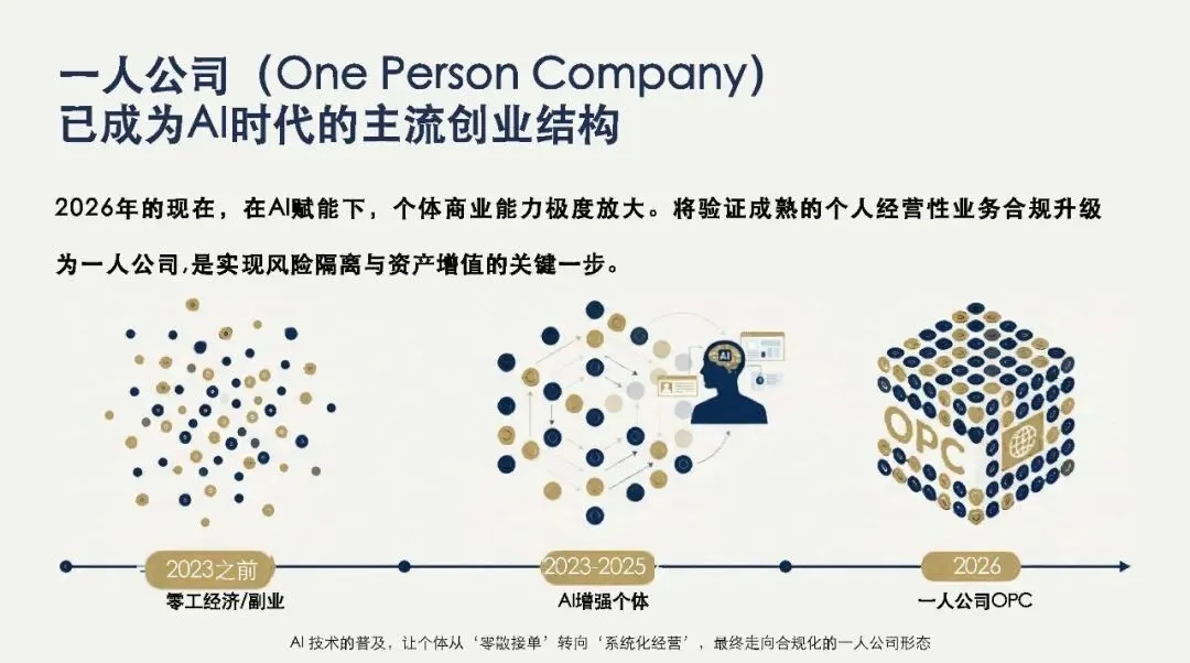 2023年之前,我们谈论的是零工经济与副业;2023-2025年,AI增强个体开始涌现;2026年的今天,一人公司(One Person Company, OPC)已成为AI时代的主流创业结构。