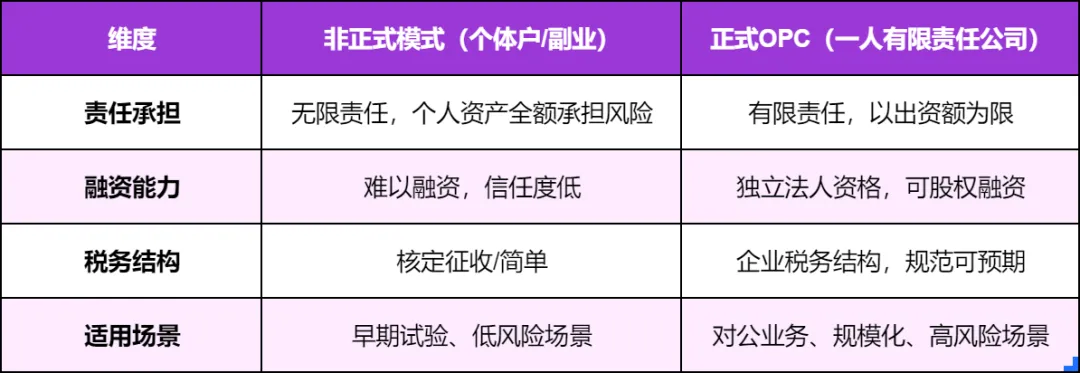 关键转变:OPC不再是"高级个体户",而是拥有独立法人资格、有限责任保护、可规模化运营的正式商业实体。