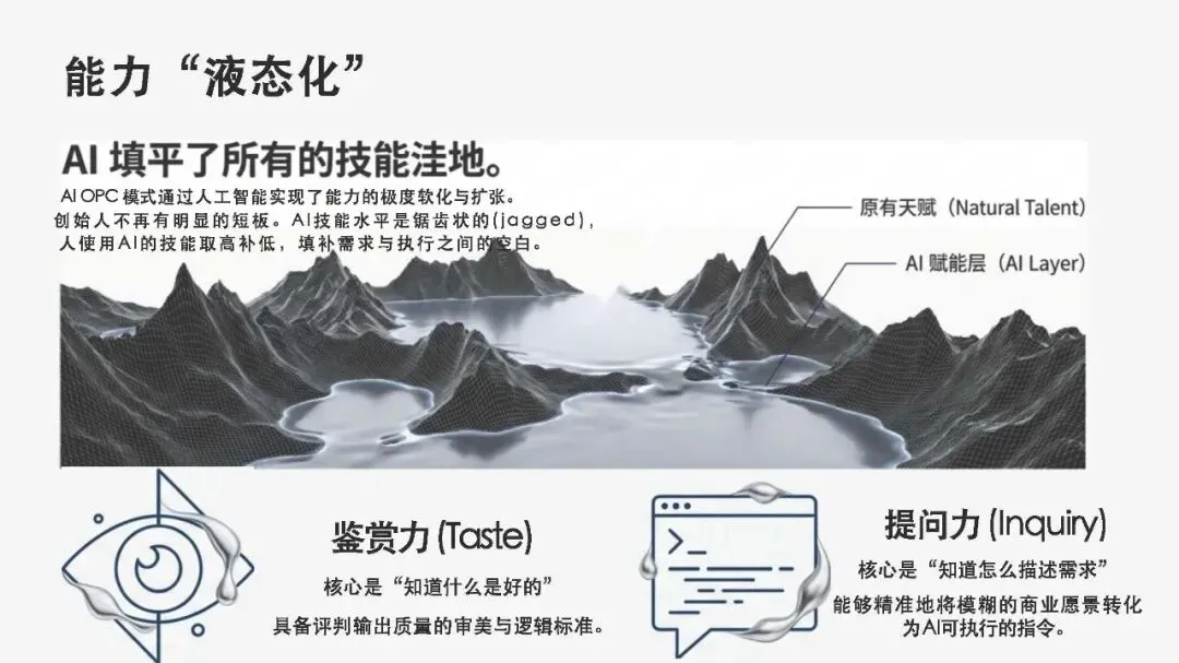 传统创业者面临的核心困境是"能力锯齿"——某些领域极强,某些领域是短板。AI OPC模式通过人工智能实现了能力的极度软化与扩张。