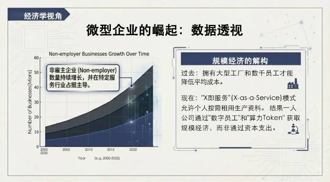 根据报告数据,美国非雇主企业(Non-employer)数量已从2000年的约1500万家增长至2025年的超过5000万家,呈指数级上升趋势。在中国,这一趋势同样迅猛——AI技术的普及,让个体从"零散接单"转向"系统化经营",最终走向合规化的一人公司形态。
