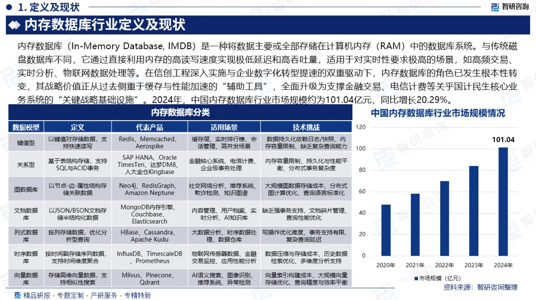 市场规模:在信创工程深入实施与企业数字化转型提速的双重驱动下,内存数据库的角色已发生根本性转变,其战略价值正从过去侧重于缓存与性能加速的“辅助工具”,全面升级为支撑金融交易、电信计费等关乎国计民生核心业务系统的“关键战略基础设施”。2024年,中国内存数据库行业市场规模约为101.04亿元,同比增长20.29%。