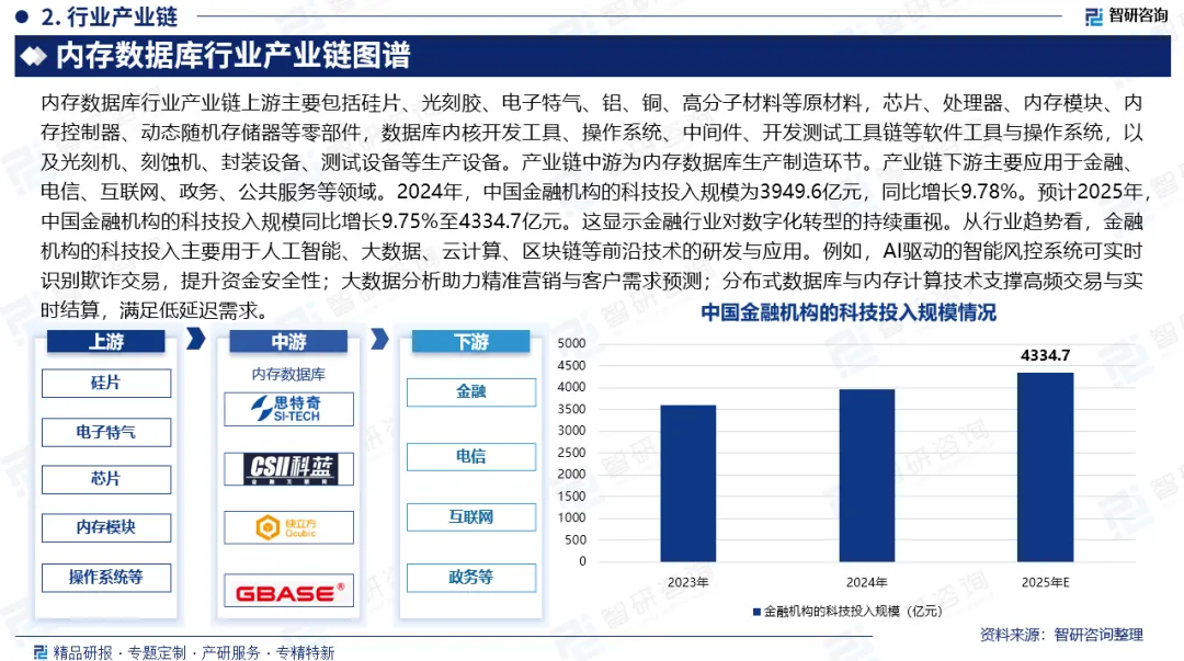 产业链核心节点:2024年,中国金融机构的科技投入规模为3949.6亿元,同比增长9.78%。预计2025年,中国金融机构的科技投入规模同比增长9.75%至4334.7亿元。这显示金融行业对数字化转型的持续重视。从行业趋势看,金融机构的科技投入主要用于人工智能、大数据、云计算、区块链等前沿技术的研发与应用。例如,AI驱动的智能风控系统可实时识别欺诈交易,提升资金安全性;大数据分析助力精准营销与客户需求预测;分布式数据库与内存计算技术支撑高频交易与实时结算,满足低延迟需求。