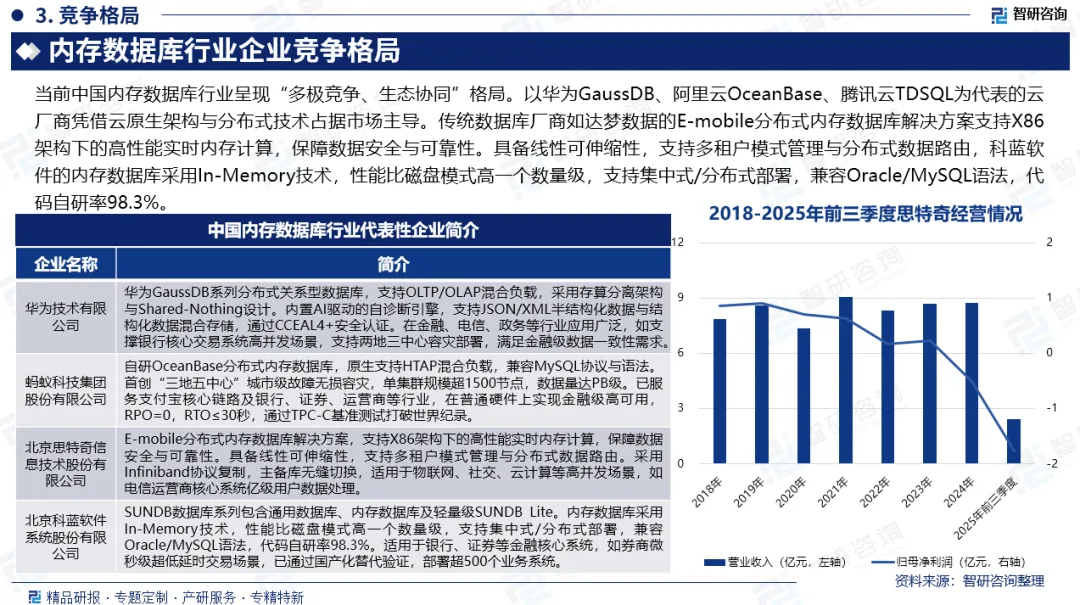 竞争情况:当前中国内存数据库行业呈现“多极竞争、生态协同”格局。以华为GaussDB、蚂蚁集团OceanBase、腾讯云TDSQL为代表的云厂商凭借云原生架构与分布式技术占据市场主导。传统数据库厂商如达梦数据的E-mobile分布式内存数据库解决方案支持X86架构下的高性能实时内存计算,保障数据安全与可靠性。具备线性可伸缩性,支持多租户模式管理与分布式数据路由,科蓝软件的内存数据库采用In-Memory技术,性能比磁盘模式高一个数量级,支持集中式/分布式部署,兼容Oracle/MySQL语法,代码自研率98.3%。