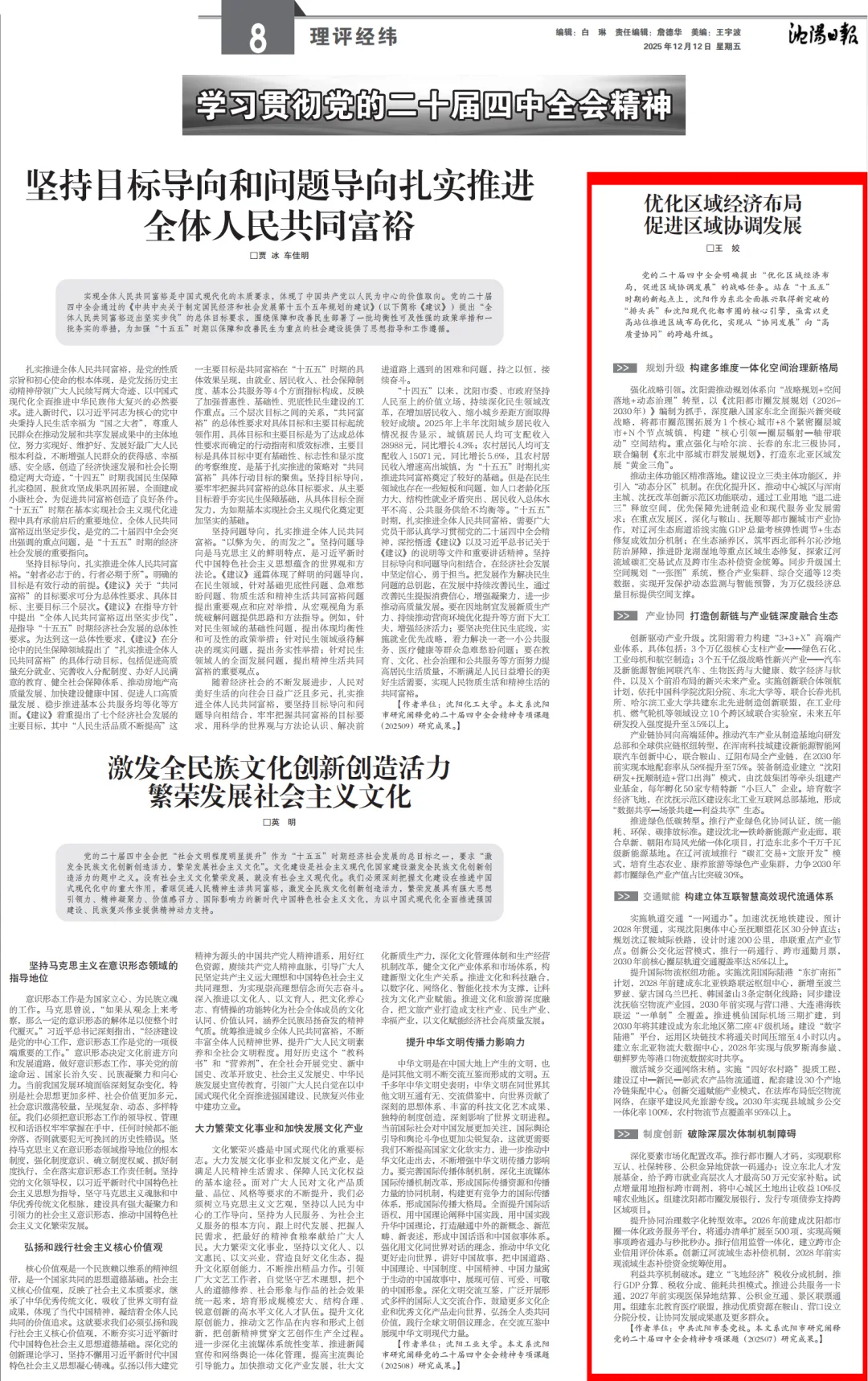党的二十届四中全会明确提出“优化区域经济布局,促进区域协调发展”的战略任务。站在“十五五”时期的新起点上,沈阳作为东北全面振兴取得新突破的“排头兵”和沈阳现代化都市圈的核心引擎,亟需以更高站位推进区域布局优化,实现从“协同发展”向“高质量协同”的跨越升级。