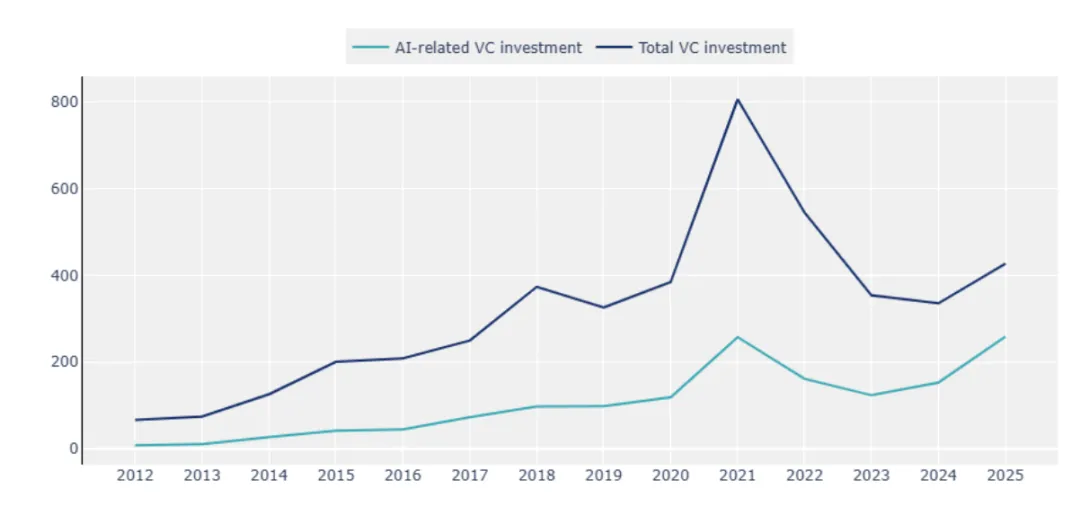 而AI VC 在 2021 年达 2573 亿美元峰值后,2023 年降至 1236 亿美元,2023-2025 年回升 109%,重回2021年前的水平。人工智能领域投资已经占到全球风险投资总额的半壁江山。