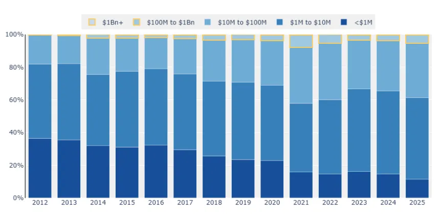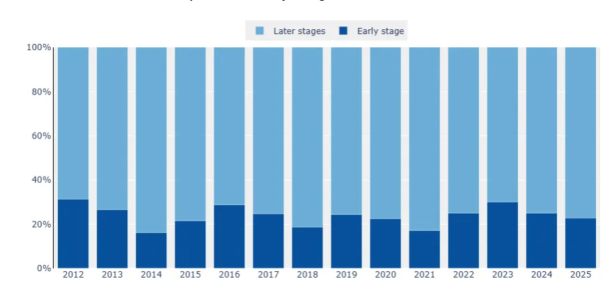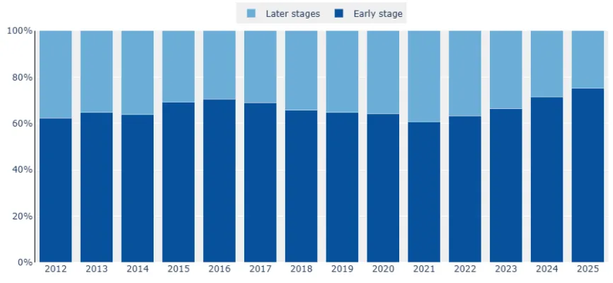 尽管早期交易的金额占比保持相对稳定,但其交易数量占比近五年持续增长,2025 年创下超 75% 的历史新高。