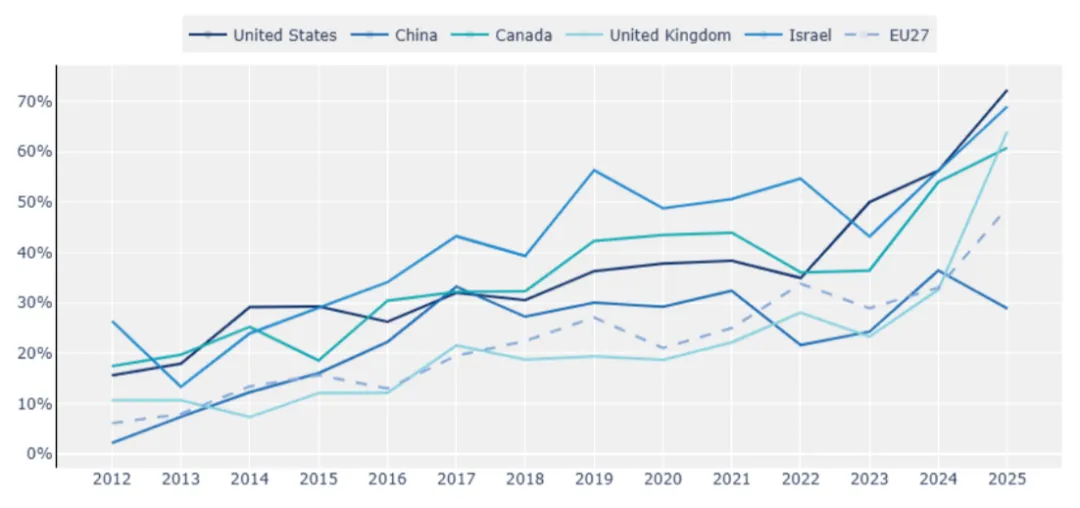 在多个国家,AI VC 已占据本国 VC 半壁江山。2025 年,美国、英国、以色列和加拿大的 VC 总额中,超半数流向了本国的 AI 企业。中国 AI 领域风险投资占比增长趋于平缓,这主要是因为能源、原材料、公用事业以及交通和自动驾驶等非人工智能领域的风险投资规模有所增加。大型交易的出现也可能迅速改变一国的风险投资总额结构,例如,2025 年英国三笔人工智能领域的大型风险投资交易总额达 67 亿美元,占英国人工智能领域风险投资流入总额的约 50%。