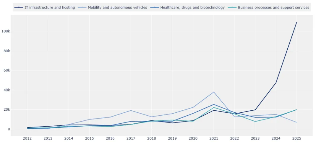 2023 年起,信息技术基础设施和托管领域(hosting)的人工智能企业成为风险投资的最大流向领域,赶超其他行业,2024 年获投规模增至 474 亿美元。2025 年,该领域获投规模大幅飙升至 1093 亿美元,占人工智能领域风险投资总额的 42% 以上,近乎其他所有行业的获投总额(1494 亿美元)。2012 至 2025 年,该领域累计获投 2561 亿美元。这一领域既包括 Databricks等算力基础设施企业,也涵盖Anthropic, Mistral and X.AI 等模型研发企业。该领域投资规模的增长,与生成式人工智能模型的研发和应用需求大幅提升,以及相关算力基础设施建设需求激增密切相关。
