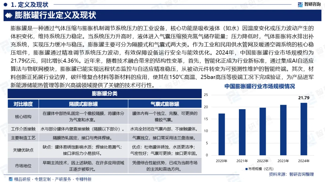 市场规模:作为工业和民用供水管网及暖通空调系统的核心稳压组件,膨胀罐通过精准调节系统压力波动,有效保障设备运行安全与能效优化。2024年,中国膨胀罐行业市场规模约为21.79亿元,同比增长4.36%。近年来,随着技术融合带来的结构性变革,首先,智能化正成为行业新标准,通过集成AI自适应算法与物联网模块,膨胀罐已能实现远程状态监控与自适应精准稳压,从被动元件转变为可预测性维护的智能终端。其次,材料创新正拓展行业边界,碳纤维复合材料等新材料的应用,使其在150℃高温、25bar高压等极端工况下完成验证,为产品进军新能源储能热管理等新兴高端领域提供了关键的技术可行性。