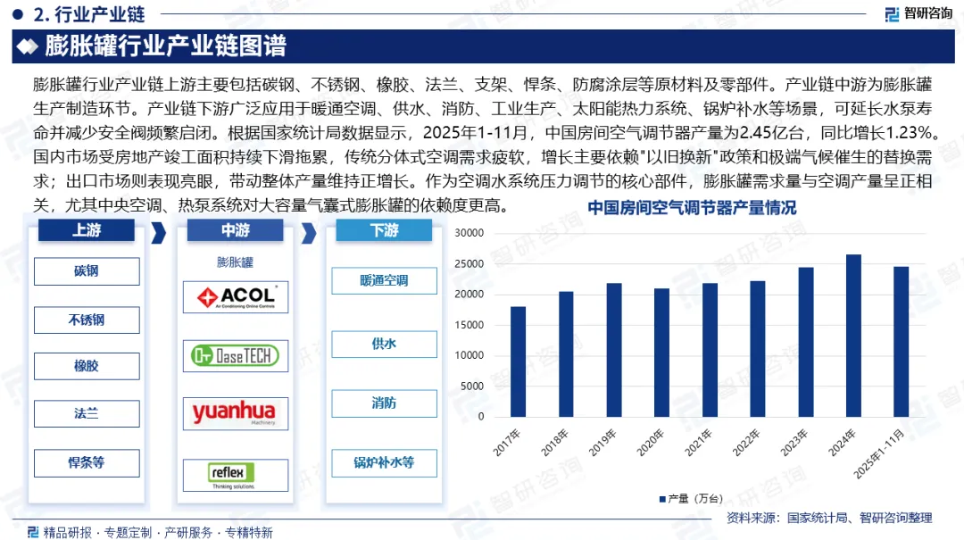 产业链核心节点:根据国家统计局数据显示,2025年1-11月,中国房间空气调节器产量为2.45亿台,同比增长1.23%。国内市场受房地产竣工面积持续下滑拖累,传统分体式空调需求疲软,增长主要依赖"以旧换新"政策和极端气候催生的替换需求;出口市场则表现亮眼,带动整体产量维持正增长。作为空调水系统压力调节的核心部件,膨胀罐需求量与空调产量呈正相关,尤其中央空调、热泵系统对大容量气囊式膨胀罐的依赖度更高。
