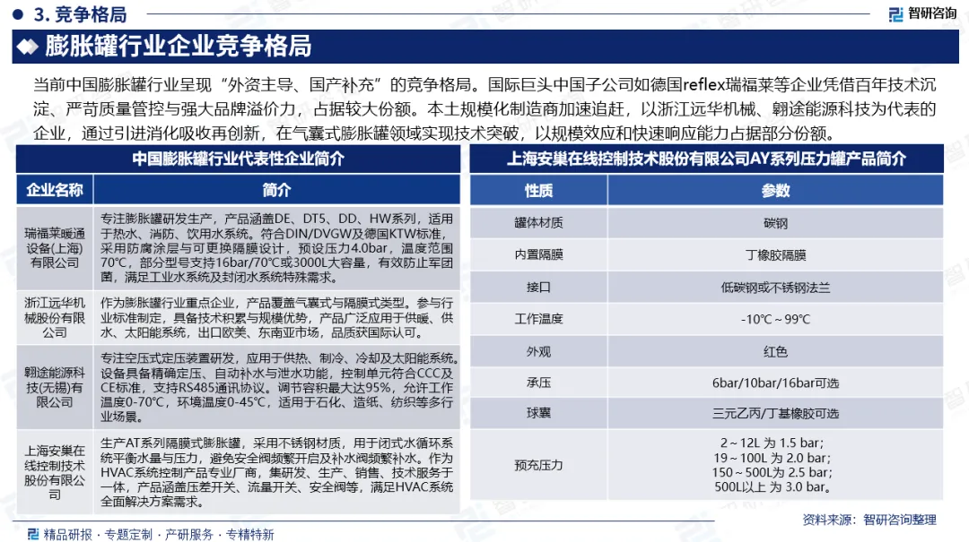 竞争情况:当前中国膨胀罐行业呈现“外资主导、国产补充”的竞争格局。国际巨头中国子公司如德国reflex瑞福莱等企业凭借百年技术沉淀、严苛质量管控与强大品牌溢价力,占据较大份额。本土规模化制造商加速追赶,以浙江远华机械、翱途能源科技为代表的企业,通过引进消化吸收再创新,在气囊式膨胀罐领域实现技术突破,以规模效应和快速响应能力占据部分份额。