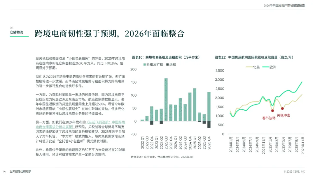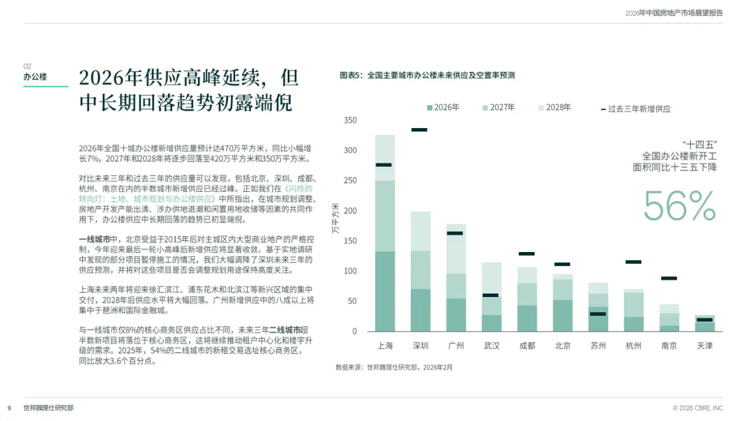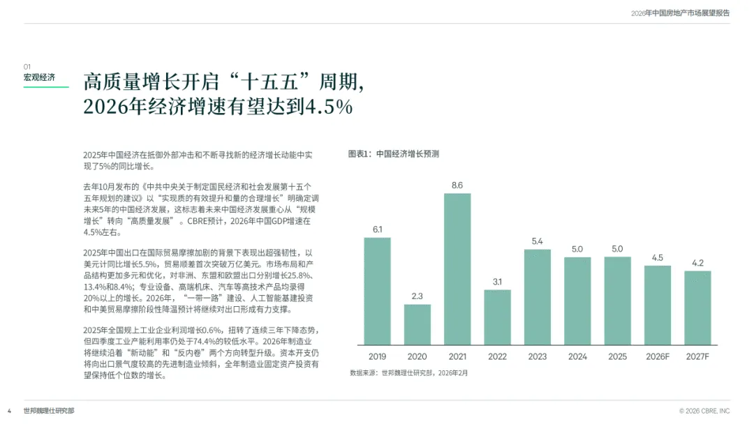 世邦魏理仕2026年中国房地产市场展望报告指出,2026年中国经济开启“十五五”高质量增长周期,GDP增速预计达4.5%,出口依托“一带一路”、人工智能基建等保持支撑,制造业向新动能与反内卷转型,扩内需仍是重点,货币政策适度宽松,房地产行业以去库存为核心,住宅销售将逐步触底,投资对经济的下拉作用减弱。