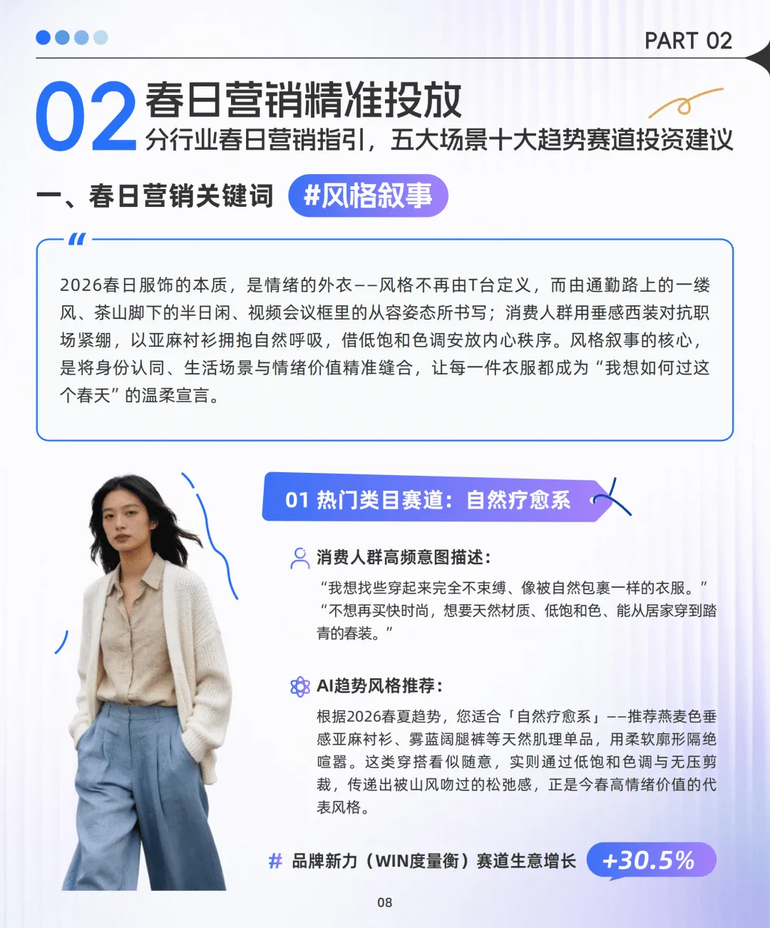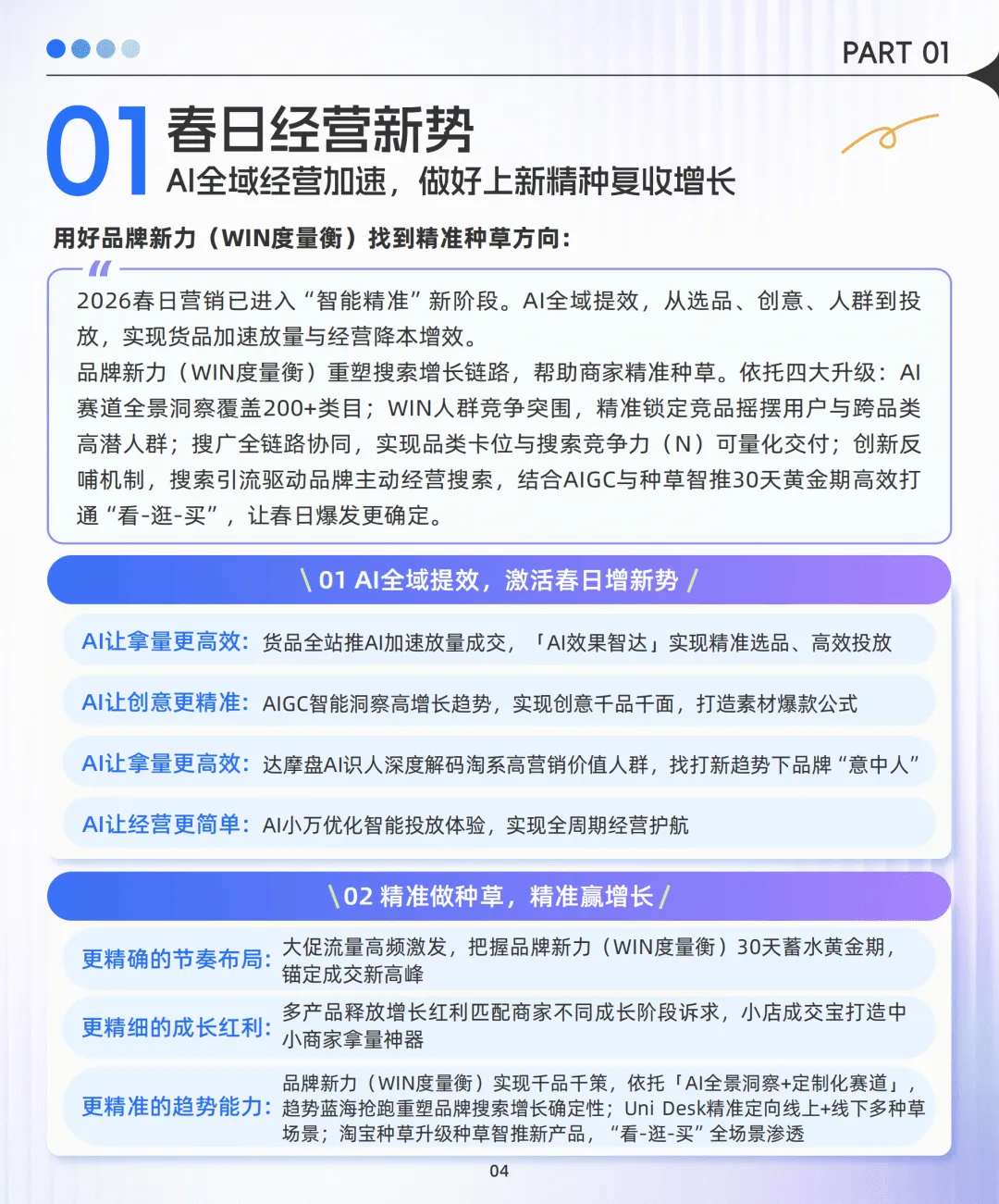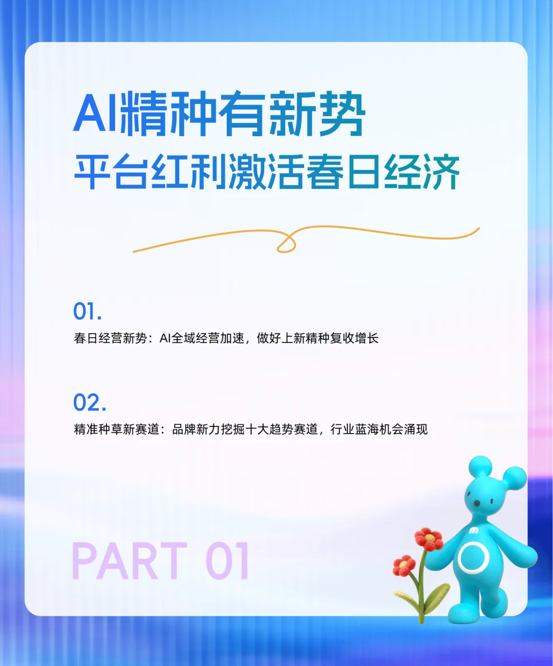 2026年阿里妈妈38&春上新经营蓝宝书以“AI启新,精种增长”为核心,围绕春日经营推出全域经营策略,依托AI技术与品牌新力WIN度量衡,激活春日经济增长新势能,同时针对不同成长阶段商家给出定制化投放指引,挖掘出五大场景十大趋势赛道的行业蓝海机会。