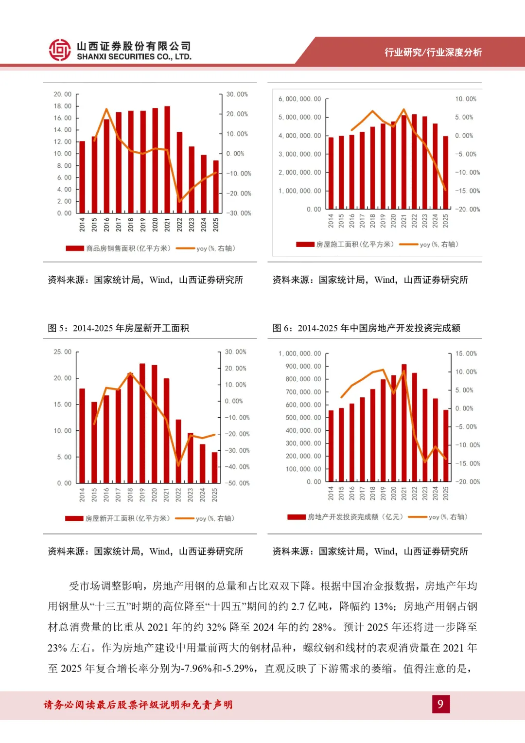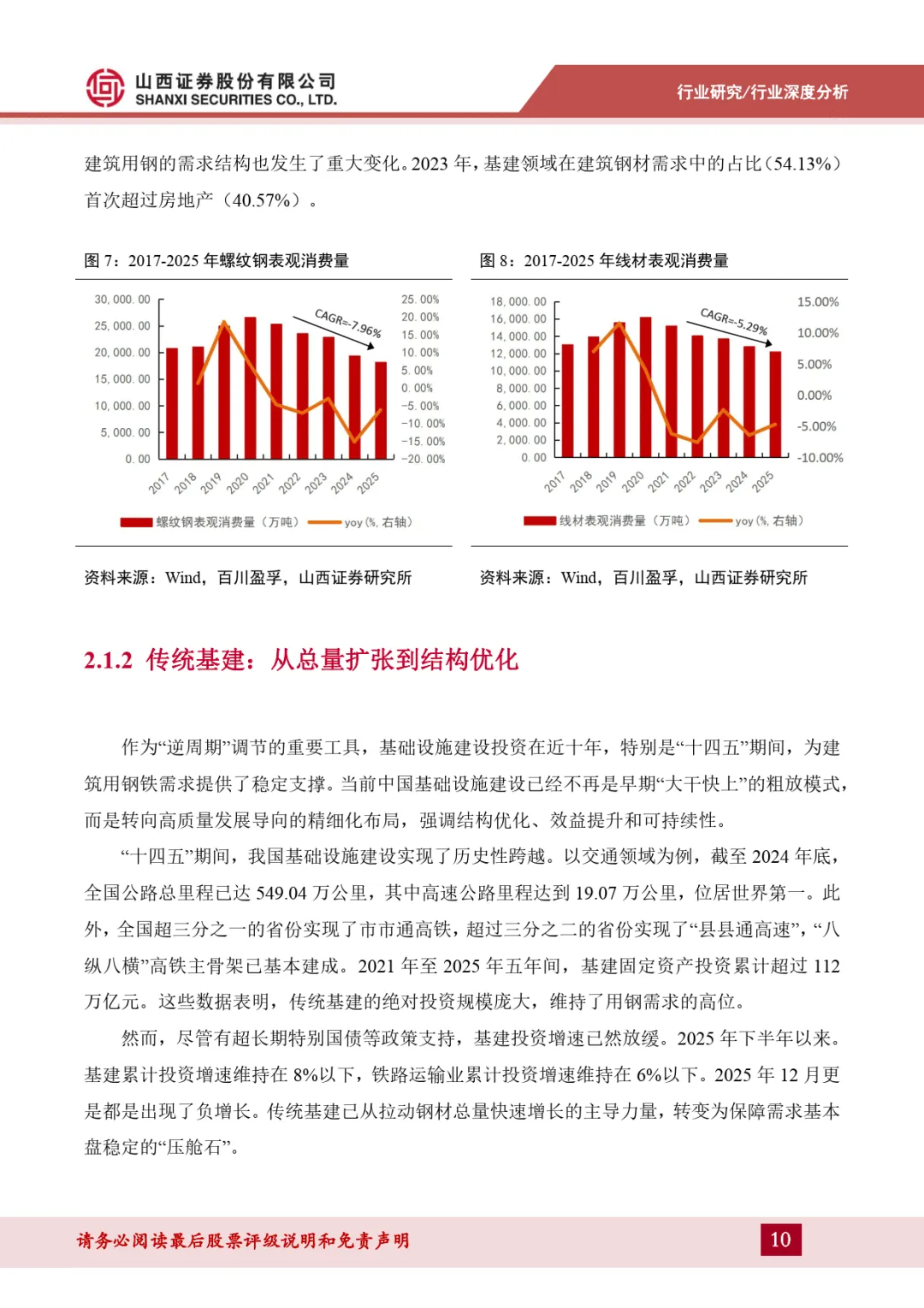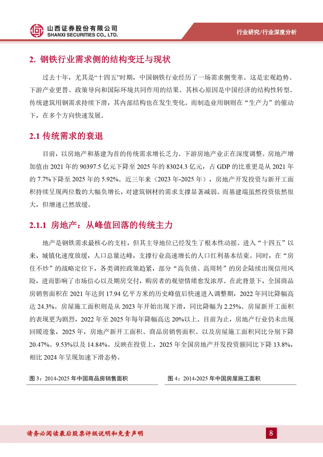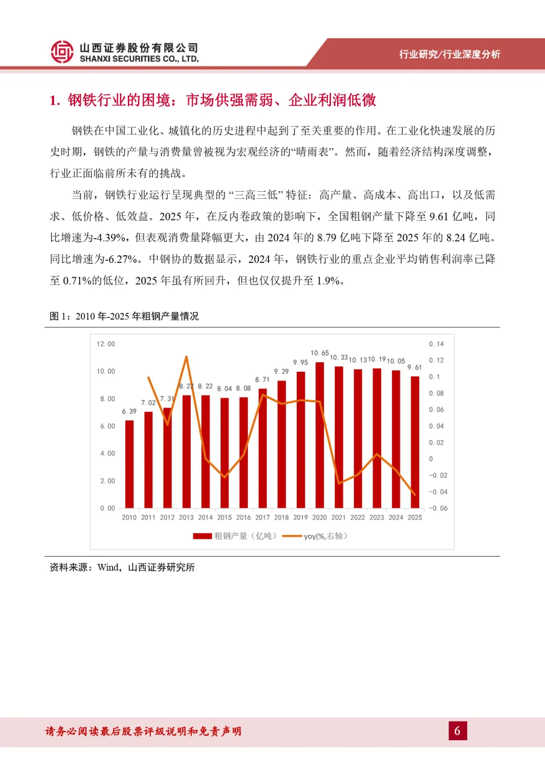2026 年 2 月山西证券发布的钢铁行业深度报告指出,当前钢铁行业深陷 “三高三低” 困境,核心矛盾为需求趋势性下滑与供给调整刚性的结构性错配,2024 年行业重点企业平均销售利润率跌至 0.71% 历史低位,2025 年虽回升至 1.9% 但仍处低位。供给端因高炉停炉成本高、企业摊薄固定成本动机及地方政府支持,粗钢产量维持在 9.6-10.7 亿吨;需求端房地产作为传统用钢主力持续下行,2025 年房地产用钢占比预计降至 23%,传统基建增速放缓,仅作为需求 “压舱石”。————